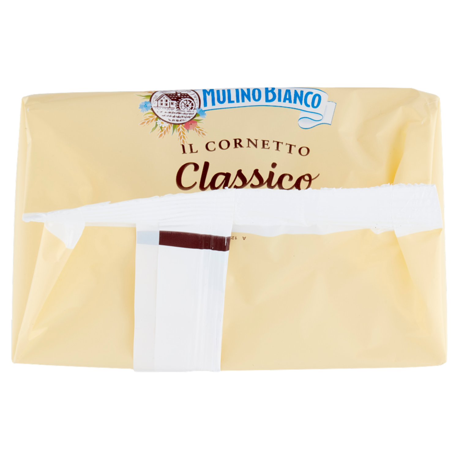 La Carta del Mulino Ogni Cornetto di questa confezione è realizzato con grano tenero da agricoltura sostenibile, seguendo le 10 regole della Carta del Mulino, il disciplinare Mulino Bianco pensato per portare qualità nei prodotti, supportare il lavoro degli agricoltori e proteggere la biodiversità. L'intera filiera è certificata ISCC Plus. Scopri di più: mulinobianco.it/cdm Il buono che non vedi Tutte le nostre merende sono senza additivi conservanti e coloranti, senza grassi idrogenati e senza olio di palma. Si raccomanda di tenerle in un luogo fresco e asciutto. Con lievito madre - 38 Ore di lenta lievitazione Un ricco impasto, preparato con farina da agricoltura sostenibile, lievito madre, burro da panna fresca e uova da galline allevate a terra, lievitato lentamente e lavorato in soffici strati di pasta sfoglia: così nasce il Cornetto Classico Mulino Bianco.