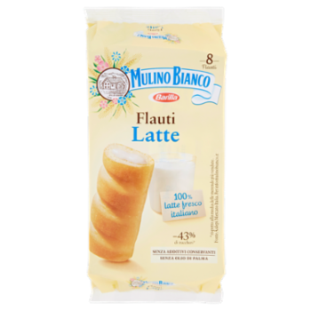 Tutto il buono che senti Latte fresco italiano di Alta Qualità - Per darti il meglio utilizziamo esclusivamente latte fresco di alta qualità di origine italiana, proveniente dalle province di Mantova e Cremona. + Con lievito madre + Tuorlo da uova fresche da galline allevate a terra Il buono che non vedi - La crema è preparata fresca e pastorizzata appena prima della farcitura per evitare l'utilizzo di additivi conservanti. - Tutte le nostre merende sono senza additivi conservanti e coloranti, senza grassi idrogenati e senza olio di palma. Per maggiori informazioni visita il sito www.mulinobianco.it 1 Flauto latte (35 g) + 1 spremuta d'arancia fresca (200 ml) apportano circa 811 kJ / 194 kcal pari al 10% dell'assunzione di riferimento di un adulto medio (8400 kJ / 2000 kcal) Variare spesso i cibi e seguire uno stile di vita fisicamente attivo è il modo giusto per avere una vita sana.