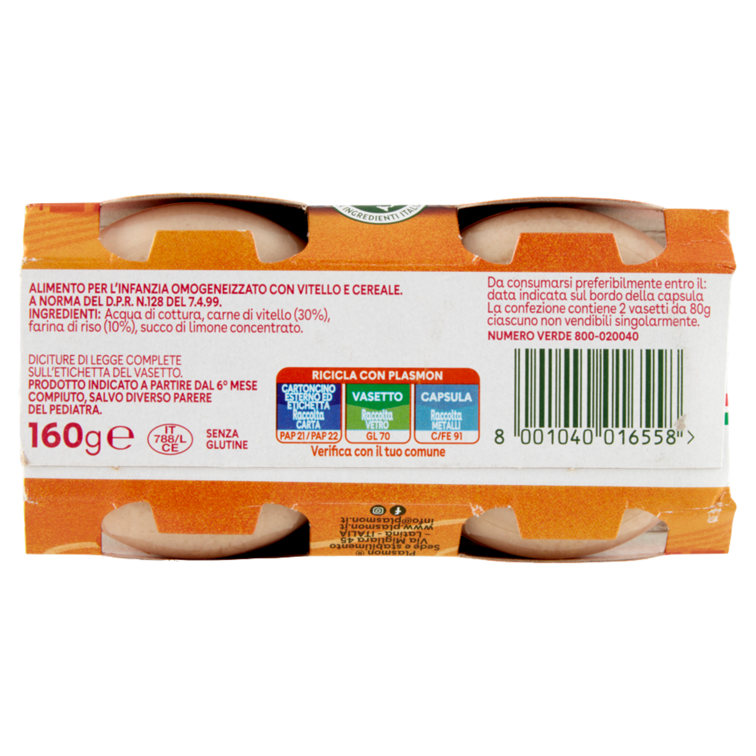 6 - 36 mesi Lo svezzamento è un viaggio alla scoperta di gusti e consistenze. Plasmon, in accordo con l'OMS, sostiene l'allattamento esclusivo al seno per almeno i primi sei mesi di vita, e ove possibile fino ai due anni quale componente lattea della sua dieta salvo diverso parere del pediatra. Filiera italiana certificata Tracciabilità e sicurezza garantite da Oasi nella crescita Elevati standard di qualità da allevamenti italiani selezionati Attenti all'ambiente confezione riciclabile Prodotto in Italia - Con ingredienti italiani Filiera certificata - In collaborazione con il Ministero delle Politiche Agricole, Alimentari e Forestali Ricetta semplice e cottura al vapore Acqua di cottura Vitello 100% italiano Farina di riso Succo di limone Solo quello che vedi trasparenza dal campo al vasetto - Senza amidi e aromi aggiunti - Senza sale e olio aggiunti - Senza coloranti* e conservanti* *Come per legge Senza glutine
