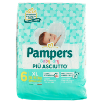 Pampers Baby-Dry Più asciutto* Mini 3-6 Kg Midi 4-9 Kg Maxi 7-18 Kg Junior 11-25 Kg XL 15-30 Kg * Rispetto ai pannolini tradizionali di altre marche Pampers Baby-Dry Mutandino Prova la coccola di Pampers Baby-Dry Mutandino! Tutto l'asciutto di Baby-Dry, con la comoda fascia elastica avvolgente. Midi 6-11 Kg Maxi 8-15 Kg Junior 12-18 Kg XL 15+ Kg XXL 17+ Kg Mentre il tuo bimbo imparava a contare fino a tre, noi riducevamo a zero i rifiuti in discarica della nostra fabbrica.* scopri l'impegno di Pampers e la sicurezza dei nostri prodotti su www.pampers.it/sostenibilità Pampers Con amore si cambia *periodo: 2019 Vuoi sapere di più sul codice Pampers? Vai su www.pampers.it