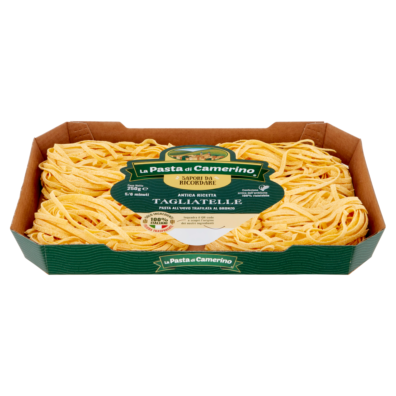 La Pasta di Camerino Sapori da ricordare Sulle colline dell'entroterra marchigiano la brezza del Mare Adriatico si mescola all'aria pura e alla terra genuina dei monti Sibillini. È qui che nasce La Pasta di Camerino, ruvida e porosa come quella fatta in casa, realizzata con cura e nel rispetto dei migliori metodi artigianali. Perfetta per catturare i sughi ed esaltare ogni piatto. Unica per tradizione perché: - Solo ingredienti di prima qualità di filiera 100% italiana - Fedele alla ricetta originale con ben 8 uova per ogni kg di farina - Triplo impasto lento - Trafilatura al bronzo - Essiccazione lentissima a basse temperature Riscopri i sapori che vivono nella memoria, il benessere che deriva da una migliore qualità della vita e da relazioni genuine e autentiche, come quelle di una volta. Scopri i nostri valori su www.lapastadicamerino.it Da sempre siamo fieri di dichiarare la provenienza degli ingredienti di alta qualità usati per i nostri prodotti. Inquadra questo QR code con il tuo smartphone o visita il sito filiera.lapastadicamerino.it e inserisci il lotto numerico che trovi stampato nel riquadro bianco. Inquadra il QR code e scopri l'origine dei nostri ingredienti