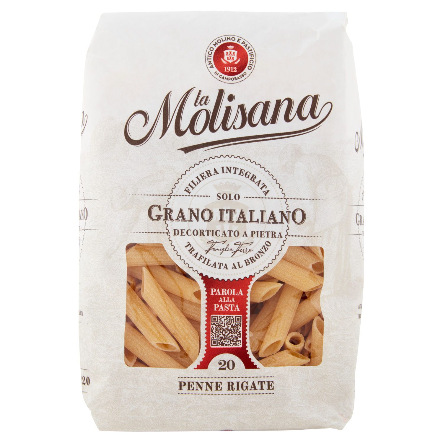 La Molisana Antico Molino e Pastificio in Campobasso 1912 Famiglia Ferro Azienda 100% italiana da filiera integrata Fondata nel 1912 da una famiglia di imprenditori italiani, interamente di proprietà italiana. Il grano Utilizziamo solo grano coltivato in Molise, Abruzzo, Puglia, Lazio e Marche, regioni da sempre vocate alla produzione di grano duro di alta qualità. Il molino Maciniamo da cinque generazioni il miglior grano, lo decortichiamo a pietra per produrre semole più sicure dal punto di vista igienico-sanitario. Il pastificio Trafiliamo al bronzo per ottenere una pasta ruvida e tenace con un'eccellente tenuta in cottura. L'acqua Impastiamo le nostre semole con acqua pura, iposodica con caratteristiche oligominerali delle sorgenti del Matese. LifeGate impatto zero CO₂ La Molisana partecipa al progetto Impatto Zero di Lifegate grazie al quale sono state calcolate, ridotte e compensate le emissioni di CO2 derivanti dalla produzione di questa confezione, tramite l'acquisto di crediti di carbonio generati dalla creazione e tutela di foreste nel mondo. Aria pura di montagna Acqua cristallina di sorgente Mugnai da cinque generazioni