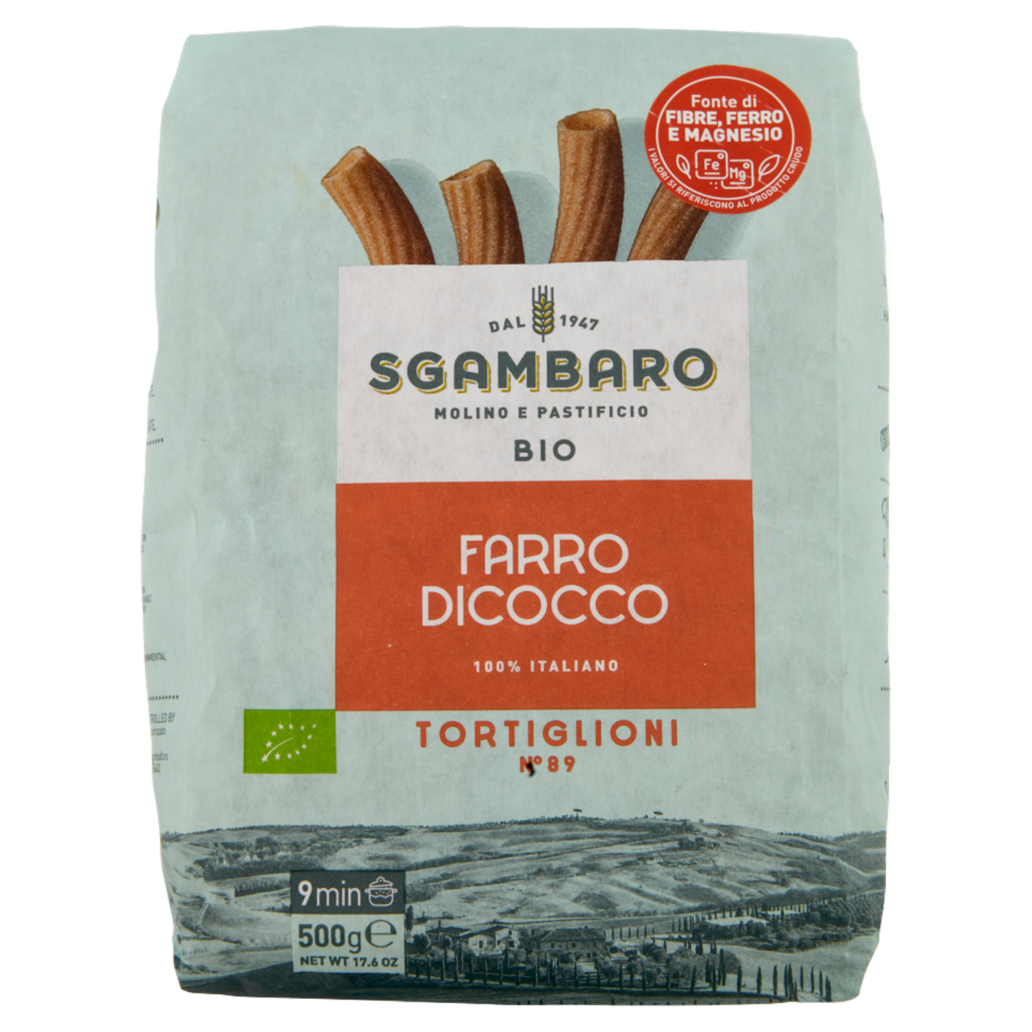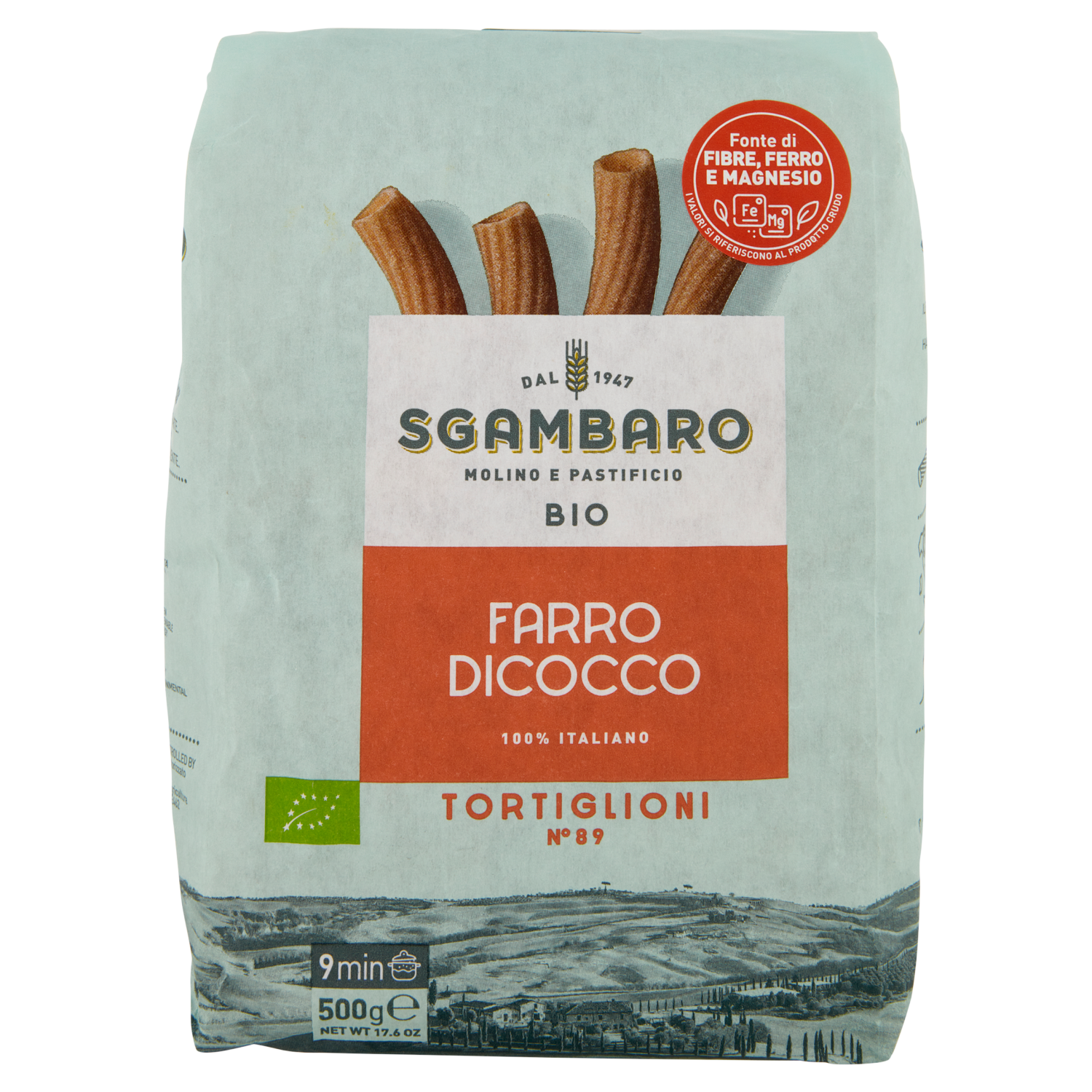 Il Farro Dicocco è un cereale molto antico, tra i più importanti della storia. Ha mantenuto inalterato il suo patrimonio genetico per millenni e si distingue per il gusto delicato e la capacità di sposarsi ai condimenti più diversi. Farro dicocco tortiglioni n°89 Trafilatura ruvida