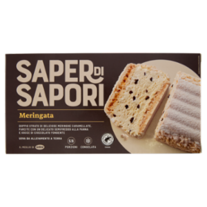 Meringata - Doppio strato di meringhe caramellate (27%), farcite con un semifreddo alla panna (72%) e gocce di cioccolato fondente. Prodotto dolciario congelato