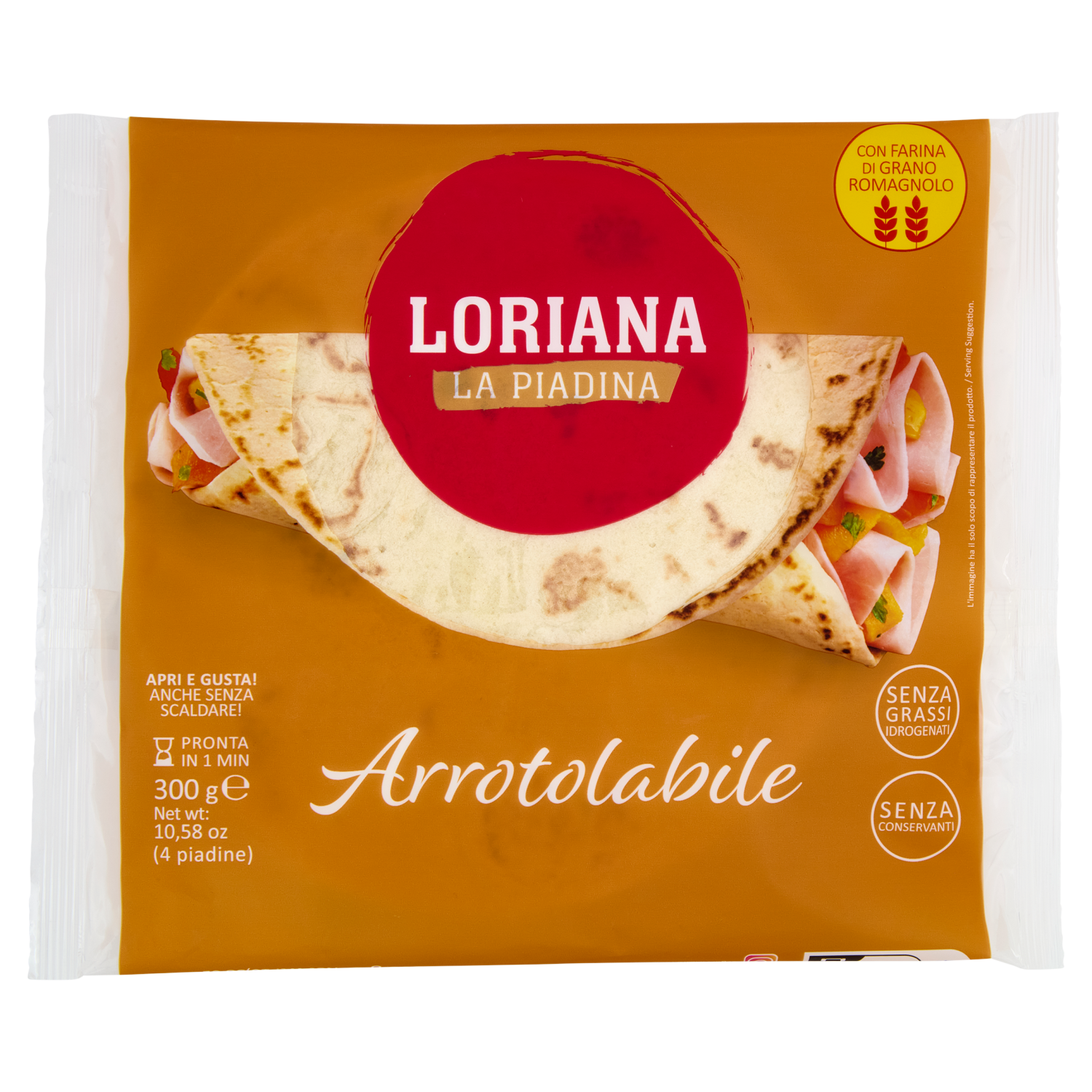 Gusta la buonissima piadina Loriana. Come facciamo a dirlo? Perchè dal 1973 facciamo solo piadine, usando i migliori ingredienti e seguendo la nostra ricetta semplice e originale. Perché la semplicità è la cosa più bella al mondo. Arrotolabile è la piadina talmente morbida e sottile che si arrotola facilmente e non si rompe! È l'ideale per preparare rotolini farciti da servire per uno stuzzicante aperitivo. Sofficissima, si può gustare anche senza scaldarla.
