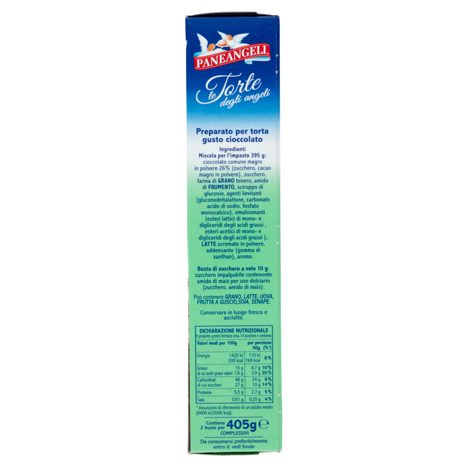 Miscela per l'impasto 395 g: cioccolato comune magro in polvere 26% (zucchero, cacao magro in polvere), zucchero, farina di grano tenero, amido di frumento, sciroppo di glucosio, agenti lievitanti (gluconodeltalattone, carbonato acido di sodio, fosfato monocalcico), emulsionanti (esteri lattici di mono- e digliceridi degli acidi grassi, esteri acetici di mono- e digliceridi degli acidi grassi), latte scremato in polvere, addensante (gomma di xanthan), aroma