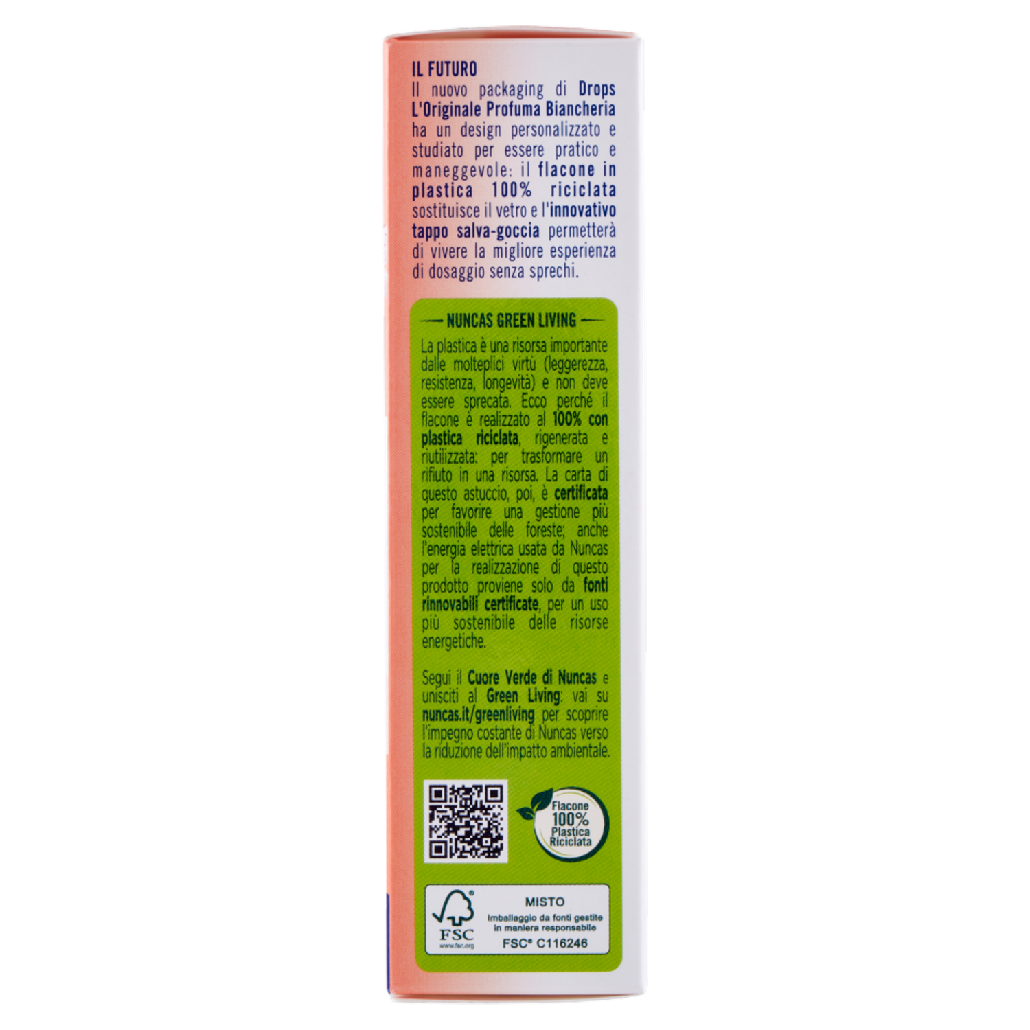 Nuncas green living La plastica è una risorsa importante dalle molteplici virtù (leggerezza, resistenza, longevità) e non deve essere sprecata. Ecco perchè il flacone è realizzato al 100% con plastica riciclata, rigenerata e riutilizzata: per trasformare un rifiuto in una risorsa. La carta di questo astuccio, poi, è certificata per favorire una gestione più sostenibile delle foreste; anche l'energia elettrica usata da Nuncas per la realizzazione di questo prodotto proviene solo da fonti rinnovabili certificate, per un uso più sostenibile delle risorse energetiche. Segui il Cuore Verde di Nuncas e unisciti al Green Living: vai su nuncas.it/greenliving per scoprire l'impegno costante di Nuncas verso la riduzione dell'impatto ambientale.