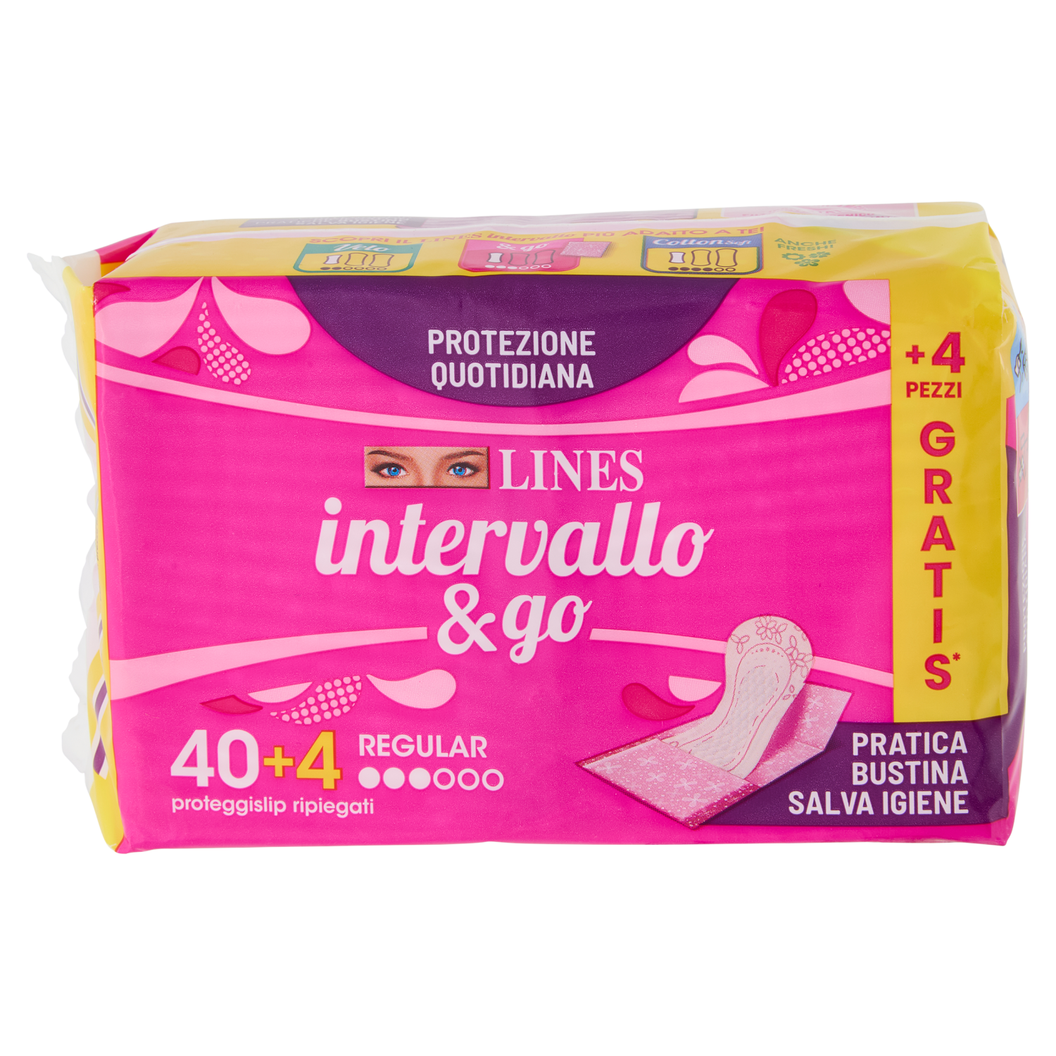 40 + 4 Gratis* proteggislip *44 al prezzo di 40, calcolato sul prezzo al rivenditore della confezione da 40 pezzi. Il prezzo finale è quello esposto. Nei Lines Intervallo trovi il Codice Lines. Scopri come vincere fantastici premi su www.lines.it Regolamento e privacy su www.lines.it