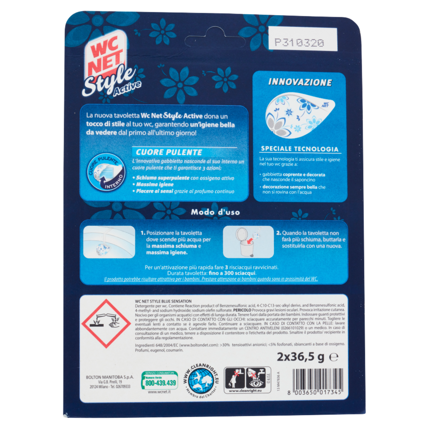 Wc Net Style Blue Sensation Detergente per wc. Contiene Reaction product of Benzenesulfonic acid, 4-C10-C13-sec-alkyl derivs. and Benzenesulfonic acid, 4-methyl-and sodium hydroxide; sodium olefin sulfonate. PERICOLO Provoca gravi lesioni oculari. Provoca irritazione cutanea. Nocivo per gli organismi acquatici con effetti di lunga durata. Tenere fuori dalla portata dei bambini. Indossare guanti protettivi e proteggere gli occhi. IN CASO DI CONTATTO CON GLI OCCHI: sciacquare accuratamente per parecchi minuti. Togliere le eventuali lenti a contatto se è agevole farlo. Continuare a sciacquare. IN CASO DI CONTATTO CON LA PELLE: lavare abbondantemente con acqua. Contattare immediatamente un CENTRO ANTIVELENI (0266101029) o un medico. In caso di consultazione di un medico, tenere a disposizione il contenitore o l'etichetta del prodotto. Smaltire il prodotto/ recipiente in conformità alla regolamentazione. A.I.S.E. www.cleanright.eu