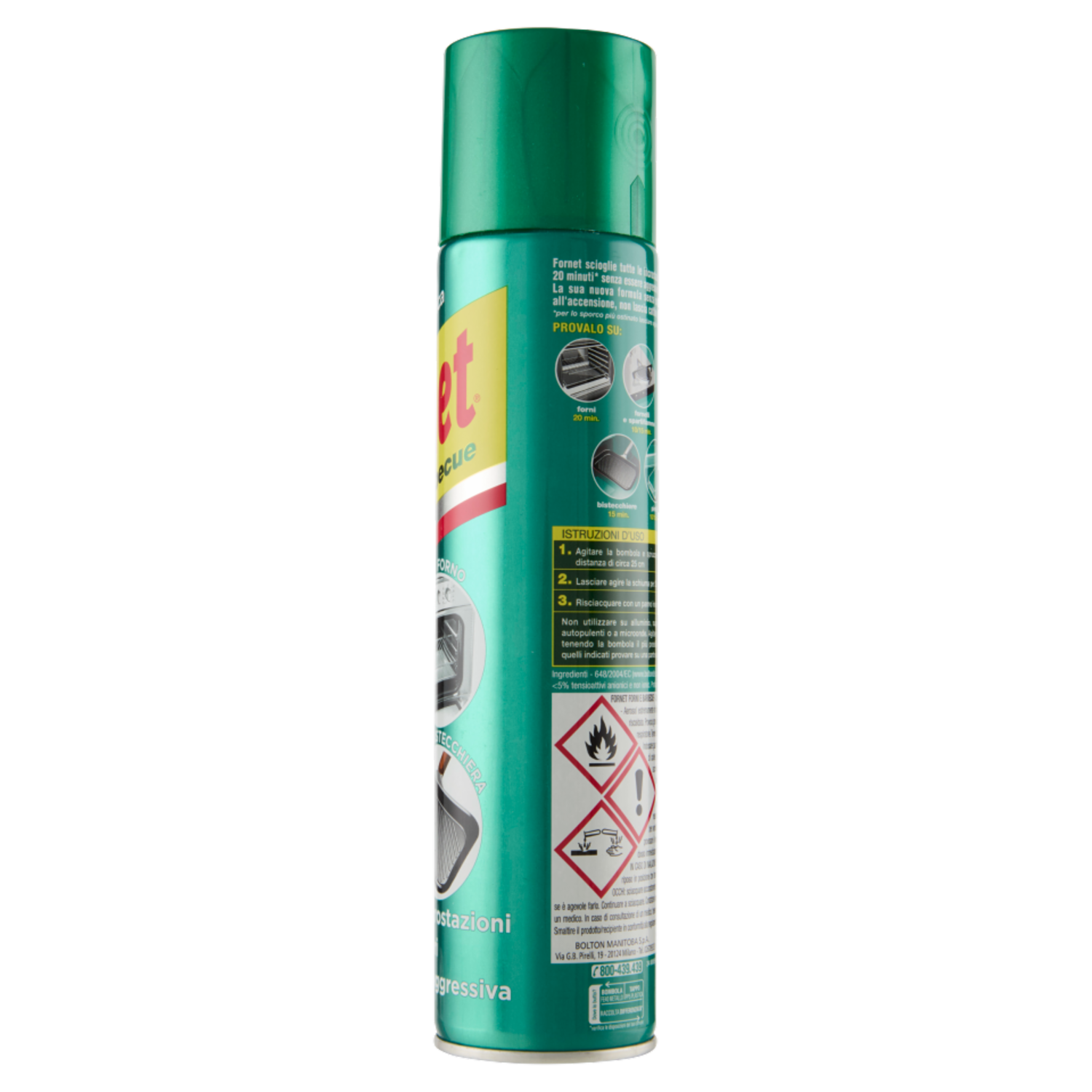 Fornet forni e barbecue. Contiene: alcohol ethoxylated; 2-aminoetanolo. PERICOLO - Aerosol estremamente infiammabile. Provoca gravi ustioni cutanee e gravi lesioni oculari. Può irritare le vie respiratorie. Contenitore pressurizzato: può scoppiare se riscaldato. Tenere fuori dalla portata dei bambini. Conservare sotto chiave. Indossare guanti protettivi e proteggere gli occhi. Tenere lontano da fonti di calore, superfici calde, scintille, fiamme libere o altre fonti di accensione. - Non fumare. Non vaporizzare su una fiamma libera o altra fonte di accensione. Non perforare né bruciare, neppure dopo l'uso. Proteggere dai raggi solari. Non esporre a temperature superiori a 50°C. Non respirare gli aerosol. Utilizzare soltanto all'aperto o in luogo ben ventilato. IN CASO DI INGESTIONE: sciacquare la bocca. NON provocare il vomito. IN CASO DI CONTATTO CON LA PELLE: togliersi di dosso immediatamente tutti gli indumenti contaminati. Sciacquare la pelle. IN CASO DI INALAZIONE: trasportare l'infortunato all'aria aperta e mantenerlo a riposo in posizione che favorisca la respirazione. IN CASO DI CONTATTO CON GLI OCCHI: sciacquare accuratamente per parecchi minuti. Togliere le eventuali lenti a contatto se è agevole farlo. Continuare a sciacquare. Contattare immediatamente un CENTRO ANTIVELENI (0266101029) o un medico. In caso di consultazione di un medico, tenere a disposizione il contenitore o l'etichetta del prodotto. Smaltire il prodotto/ recipiente in conformità alla regolamentazione.