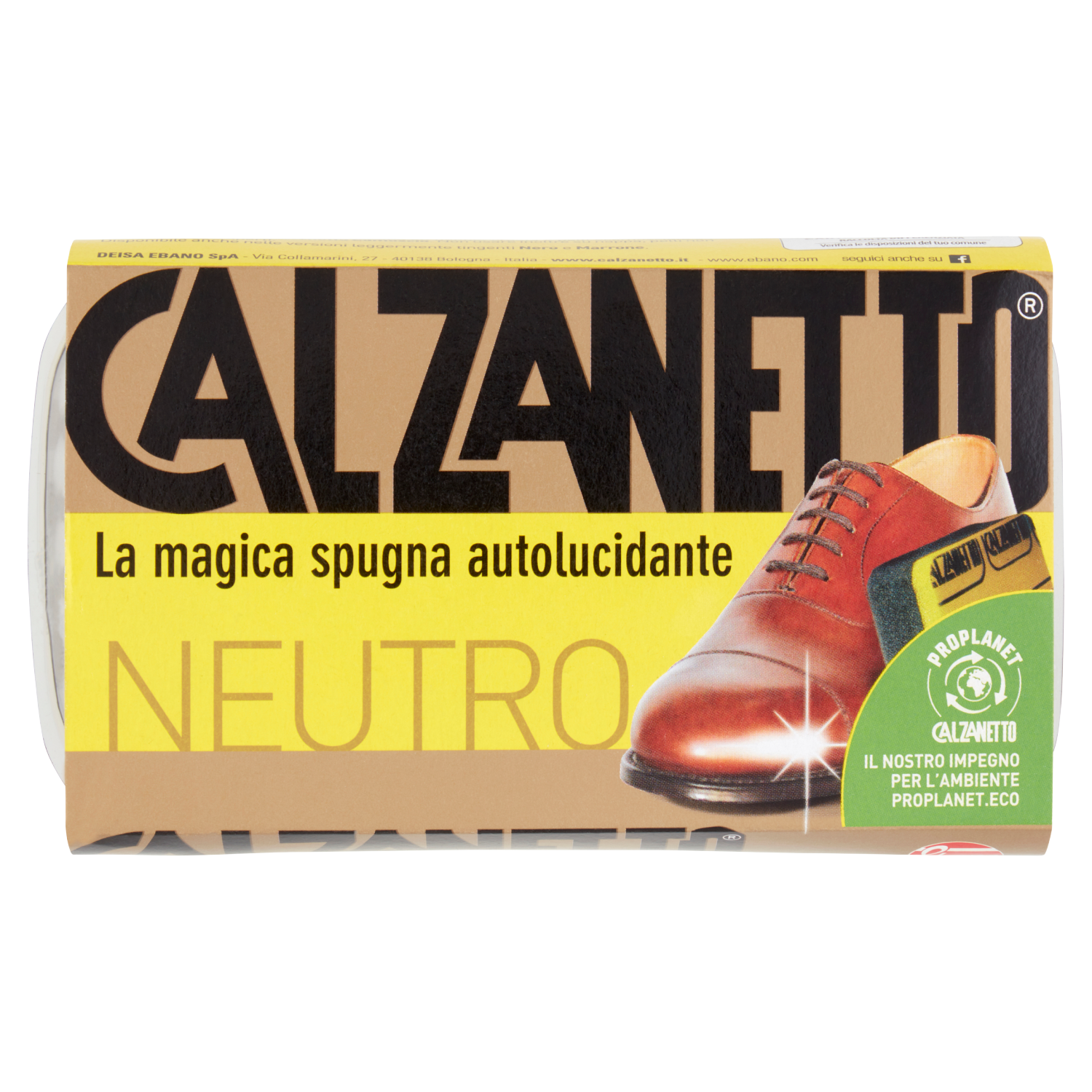 ti facilita la vita! Calzanetto è un campione di praticità: può essere usato ovunque e in qualunque momento e, grazie alla sua confezione protetta si conserva a lungo senza lasciare alcuna traccia di sporco. Pulisce, lucida e protegge tutti gli oggetti in pelle di qualsiasi colore. Pratico e veloce. Non sporca le mani. Calzanetto Neutro: Grazie agli oli di silicone ad alta densità, garantisce un velo di lucentezza uniforme e duratura sulle pelli di qualsiasi colore, in un solo gesto. Non Usare: su cuoio, vacchetta e pelli ingrassate su cui è indicato l'uso di Calzanetto Cuoio e Pelli Ingrassate; su nabuk, crosta e pelli scamosciate su cui è indicato l'uso di Calzanetto Camoscio. Non usare inoltre su nappa, pelli non trattate e a pori aperti. Disponibile anche nelle versioni leggermente tingenti Nero e Marrone. La magica spugna autolucidante imbevuta di raffinati oli di silicone ad alta densità. - Astuccio in carta 100% riciclata - Vaschetta in PET 80% riciclato