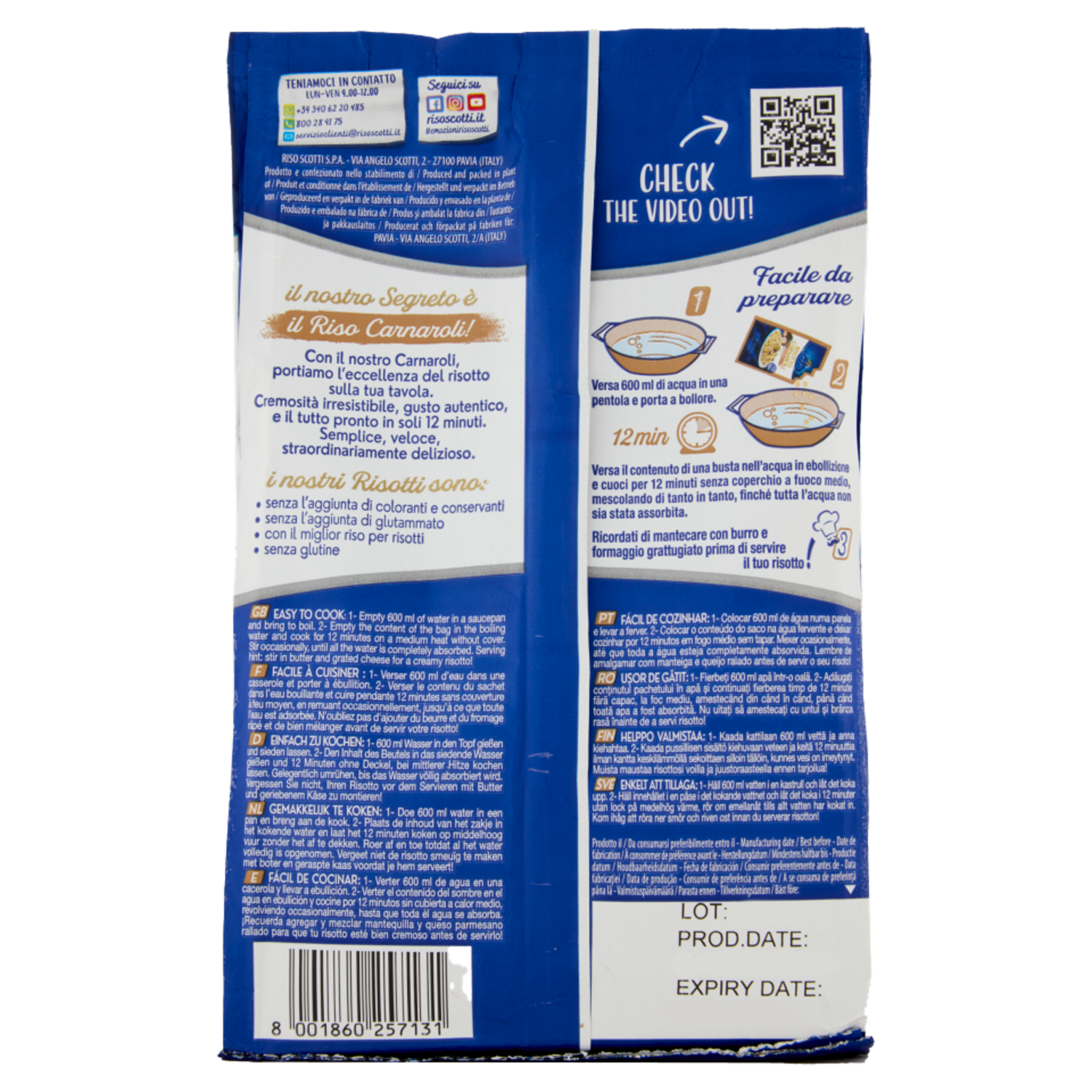 Facile da preparare 1 Versa 600 ml di acqua in una pentola e porta a bollore. 2 Versa il contenuto di una busta nell'acqua in ebollizione e cuoci per 12 minuti senza coperchio a fuoco medio, mescolando di tanto in tanto, finché tutta l'acqua non sia stata assorbita. 3 Ricordati di mantecare con burro e parmigiano prima di servire il tuo risotto!