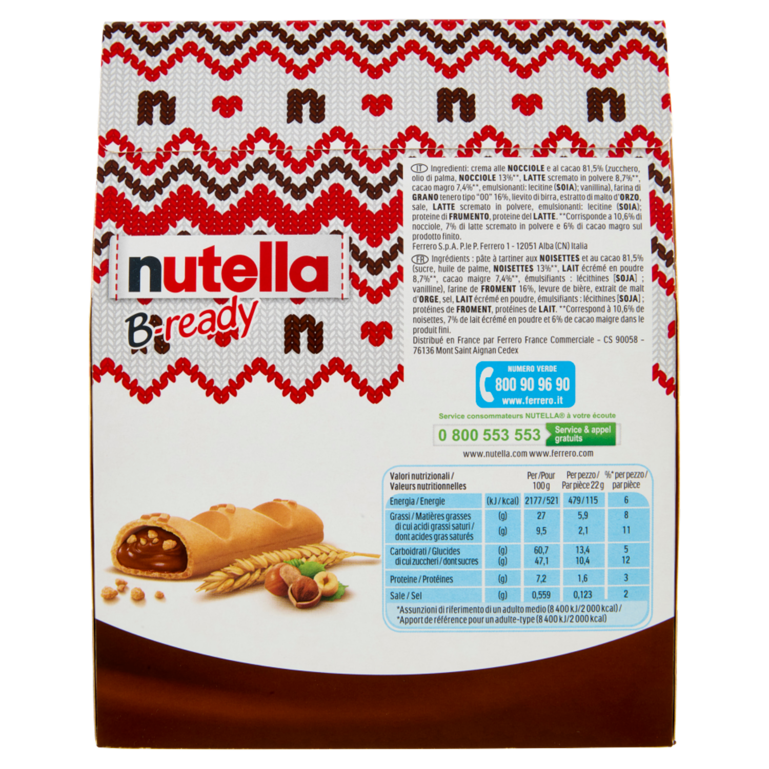 Cialda di pane di tipo "00" a forma di baguette, con farcitura di crema alle nocciole e al cacao Nutella e chicchi (2%) di cialda di pane