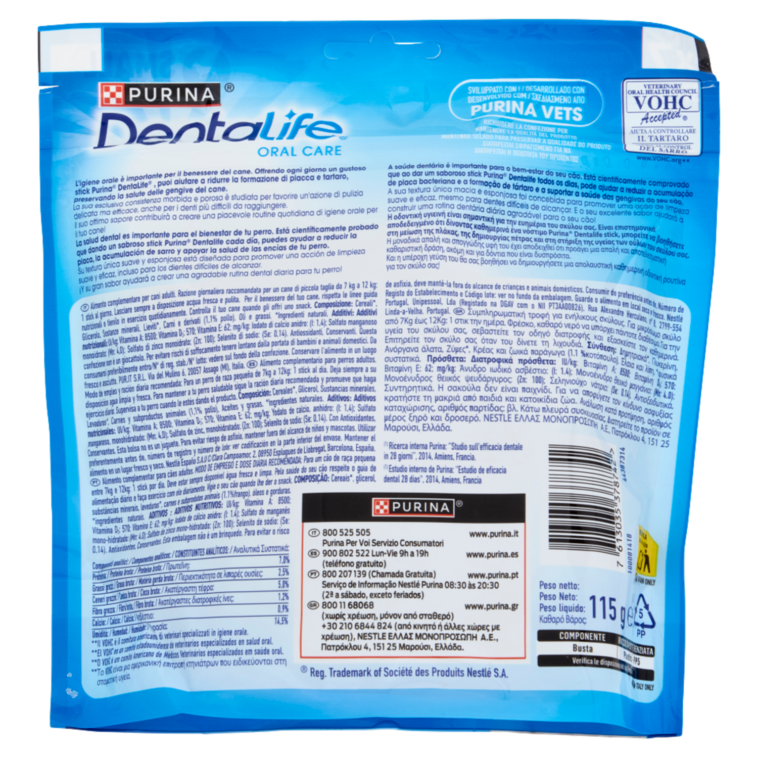 Il tuo cane ha specifiche esigenze di salute; mantenere una buona igiene orale contribuisce positivamente al suo generale benessere. Ecco perché gli esperti di PURINA hanno sviluppato PURINA DENTALIFE, un innovativo snack dentale scientificamente testato per aiutare la pulizia dei denti, anche per quelli più difficili da raggiungere in fondo alla bocca, che sono i più vulnerabili alla formazione di placca e tartaro. Con una forma studiata appositamente per massaggiare il bordo gengivale Pulizia profonda anche con azione in fondo alla bocca Contribuisce all'alito fresco 1 stick al giorno - Ingredienti nutrienti (mais, frumento) - Senza l'aggiunta di zuccheri - Vitamina D & Calcio per denti più forti - Basso contenuto di grassi - Con gustoso pollo - Senza l'aggiunta di aromi artificiali o coloranti - Nuovo - x7 Sticks - Consistenza porosa e morbida - Pulisce anche i denti più difficili da raggiungere - Specificamente provato per la riduzione della formazione del tartaro. Aiuta a ridurre la formazione della placca - Senza l'aggiunta di aromi o coloranti artificiali - Small 7-12kg