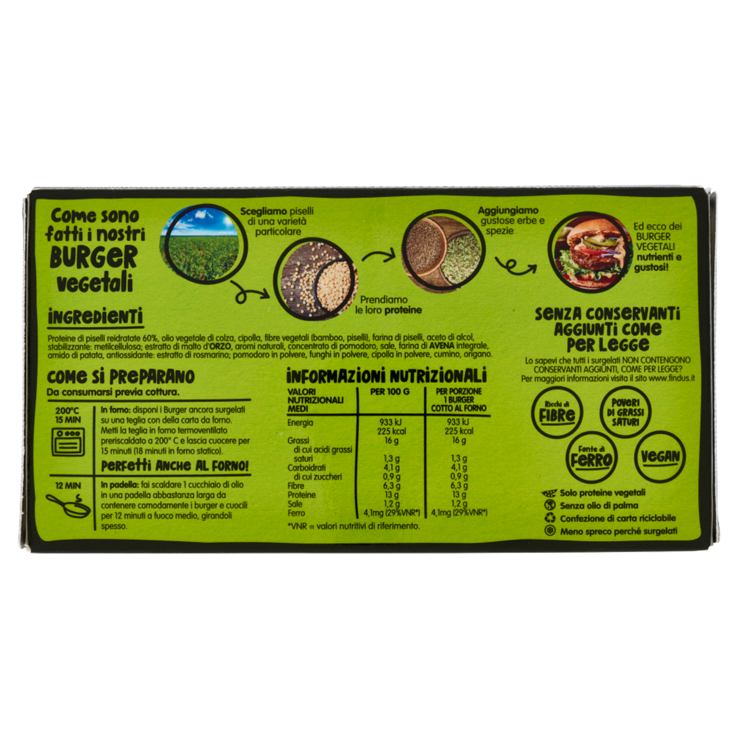 Come sono fatti i nostri Burger vegetali Scegliamo piselli di una varietà particolare Prendiamo le loro proteine Aggiungiamo gusto erbe e spezie Ed ecco dei Burger Vegetali nutrienti e gustosi! Senza conservanti aggiunti come per legge La sapevi che tutti i surgelati Non Contengono Conservanti Aggiunti, Come per Legge? Per maggiori informazioni visita il sito www.findus.it Ricchi di Fibre Poveri di grassi saturi Fonte di Ferro Vegan Solo proteine vegetali Senza olio di palma Confezione di carta riciclabile Meno spreco perché surgelati Vuoi sapere di più sui prodotti Green Cuisine? Vai su www.findusgreencuisine.it