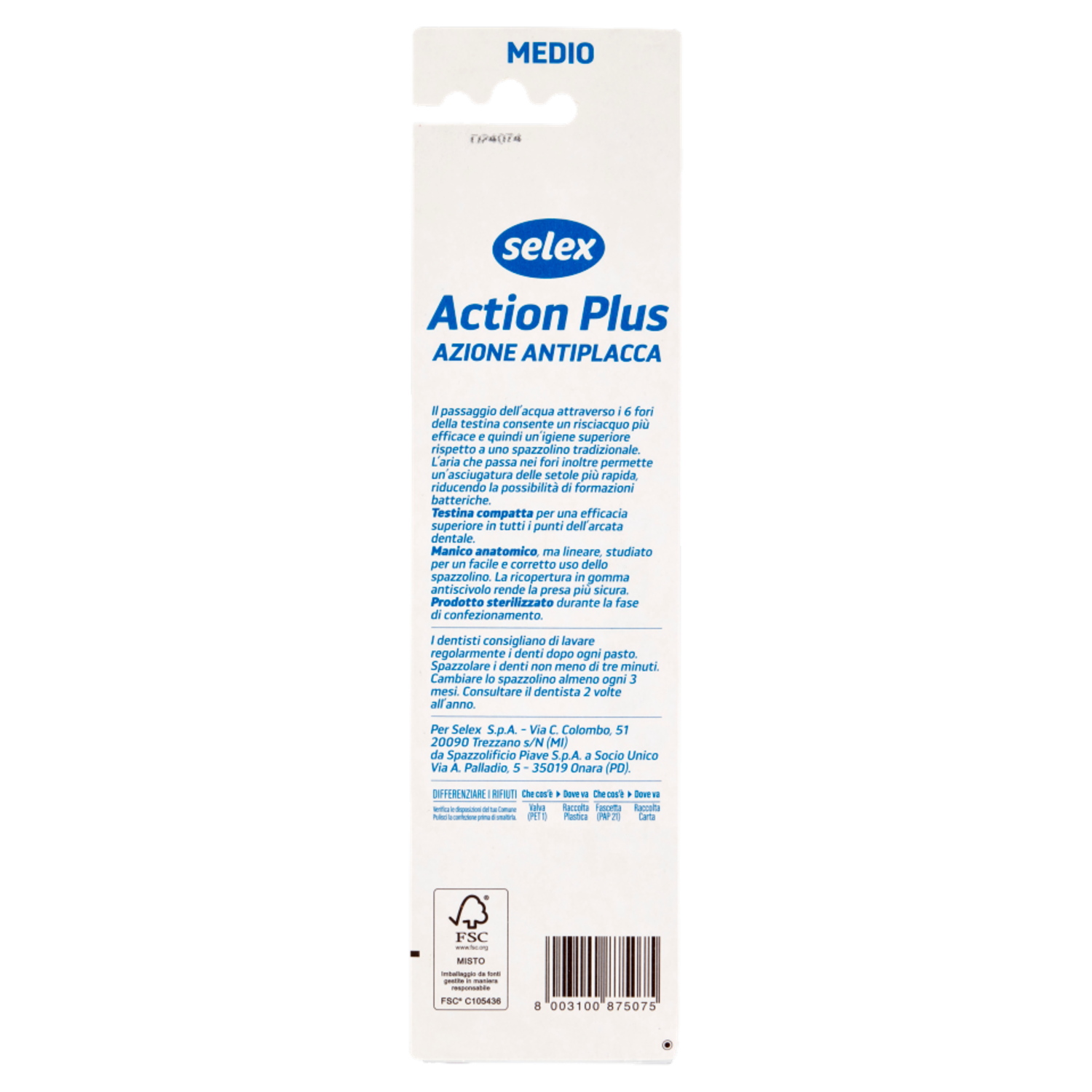 Selex Action Plus - Il passaggio dell'acqua attraverso i 6 fori della testina consente un risciacquo più efficace e quindi un'igiene superiore rispetto a uno spazzolino tradizionale. L'aria che passa nei fori inoltre permette un'asciugatura delle setole più rapida, riducendo la possibilità di formazioni batteriche. Testina compatta per una efficacia superiore in tutti i punti dell'arcata dentale. Manico anatomico, ma lineare, studiato per un facile e corretto uso dello spazzolino. La ricopertura in gomma antiscivolo rende la presa più sicura. Prodotto sterilizzato durante la fase di confezionamento.