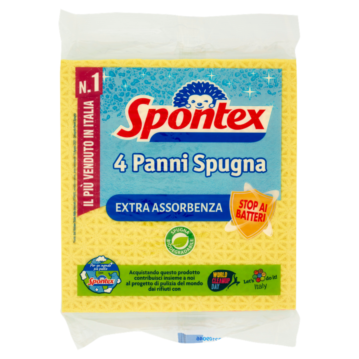 4 Panni Spugna I Panni Spugna Spontex eliminano i cattivi odori. I panni spugna sono trattati con zinco piritione, un agente antibatterico che li protegge dalla proliferazione di batteri, causa di cattivi odori. I panni spugna assorbenti, spessi e flessibili sono perfetti per asciugare e pulire le superfici. Rinforzati con trama di cotone sono resistenti all'usura e di lunga durata. Lo sapevi? I panni spugna sono realizzati in cellulosa, un materiale ultra assorbente, ogni panno può assorbire fino a 13 volte il suo stesso peso. I nostri Panni Spugna sono realizzati in cellulosa e cotone e sono 100% biodegradabili. Il 50% del cotone utilizzato è riciclato. Sono resistenti e possono essere utilizzati più volte, semplicemente lavandoli in lavatrice dopo ogni utilizzo.