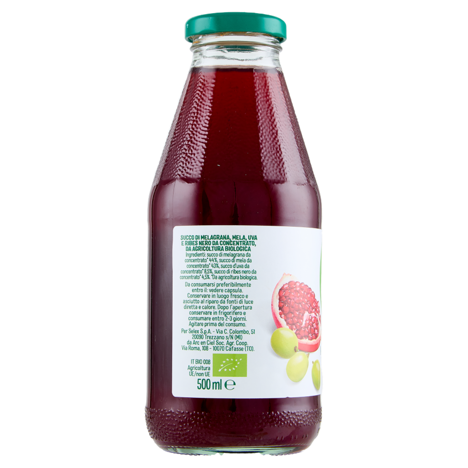 Succo di melagrana, mela, uva e ribes nero da concentrato, da agricoltura biologica