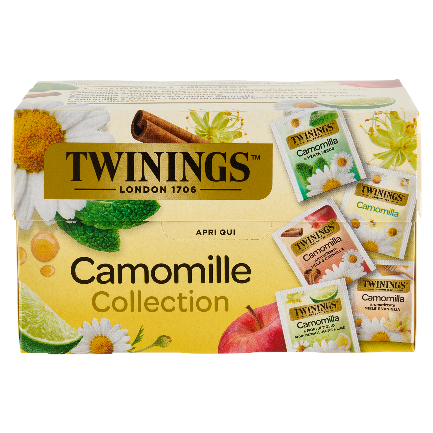 Camomilla e menta verde (4x1,5g) - Infuso di erbe con camomilla e menta verde Camomilla aromatizzata miele e vaniglia (4x1,5g) Camomilla (4x1g) Camomilla aromatizzata mela e cannella (4x1,25g) Camomilla e fiori di tiglio aromatizzati lime (4x1,25g) - Infuso con camomilla e fiori di tiglio aromatizzati al lime