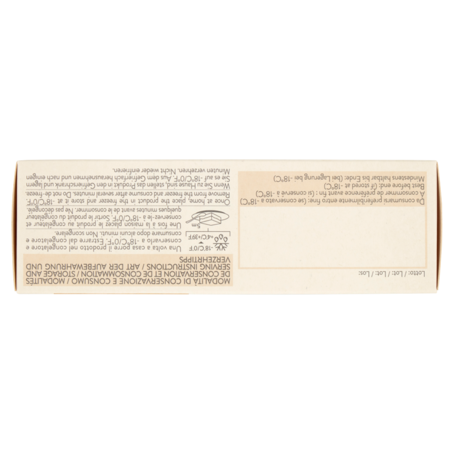Modalità di conservazione e consumo Una volta a casa porre il prodotto nel congelatore e conservarlo a -18°C/0°F. Estrarre dal congelatore e consumare dopo alcuni minuti. Non scongelare.