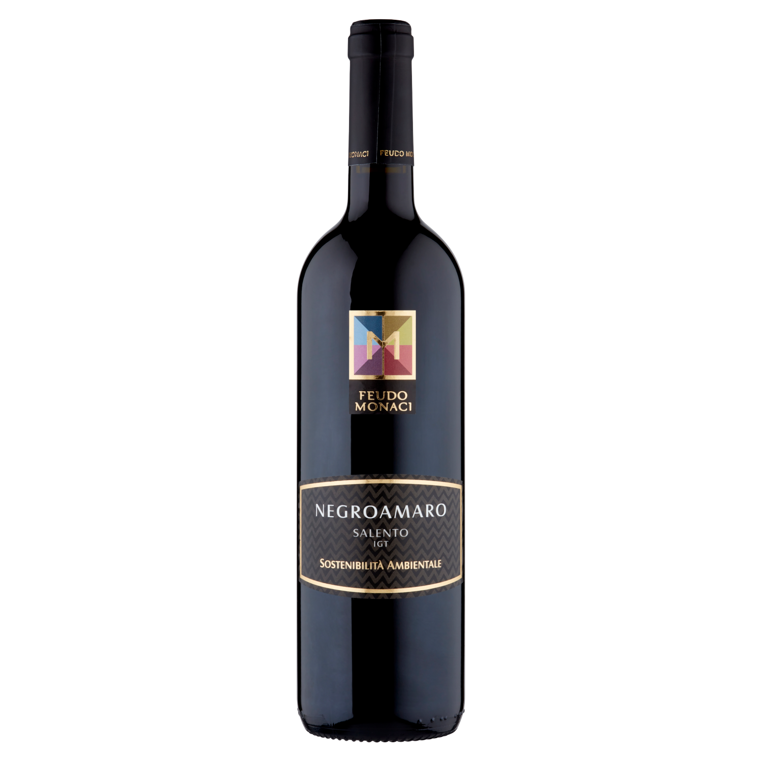 Negroamaro Salento IGT, vino rosso italiano. Ottenuto da uve negroamaro, è un vino dalla forte personalità. Rosso granato intenso, dal sapore pieno e rotondo, si accompagna perfettamente ai piatti saporiti della cucina italiana. Zona di provenienza: Puglia Salento Indicazione Geografica Tipica