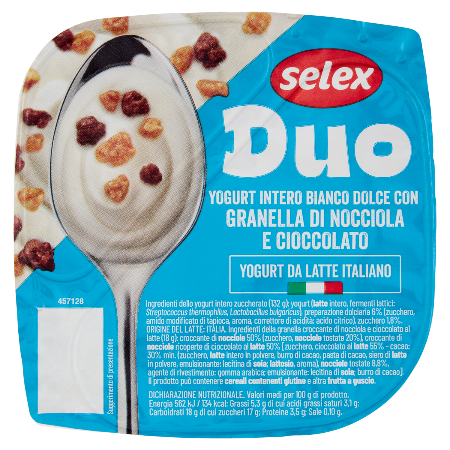 Yogurt intero zuccherato con preparazione dolciaria con granella croccante di nocciola e cioccolato