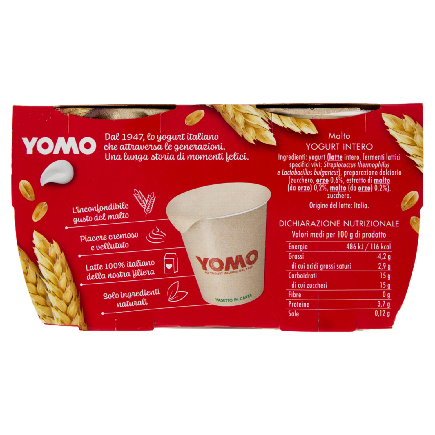 Yomo Malto con il suo gusto inimitabile e ingredienti tutti naturali! Latte italiano di filiera Solo latte italiano della filiera Granarolo e benessere animale certificato in allevamento* *DTP 142 - Cert CSQA n.53446 Vasetto in carta Tutti i vasetti Yomo 125g x 2 sono in carta