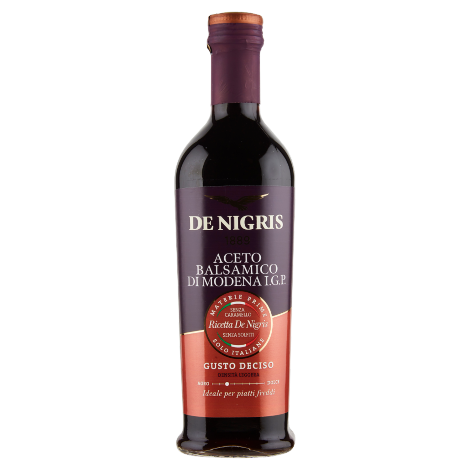 La Ricetta De Nigris, senza solfiti e senza caramello, con materie prime solo italiane, è il risultato unico di un percorso di alta qualità, che prevede l'affinamento in botte di mosto d'uva cotto con selezionati aceti di vino da filiera tracciata e certificata.