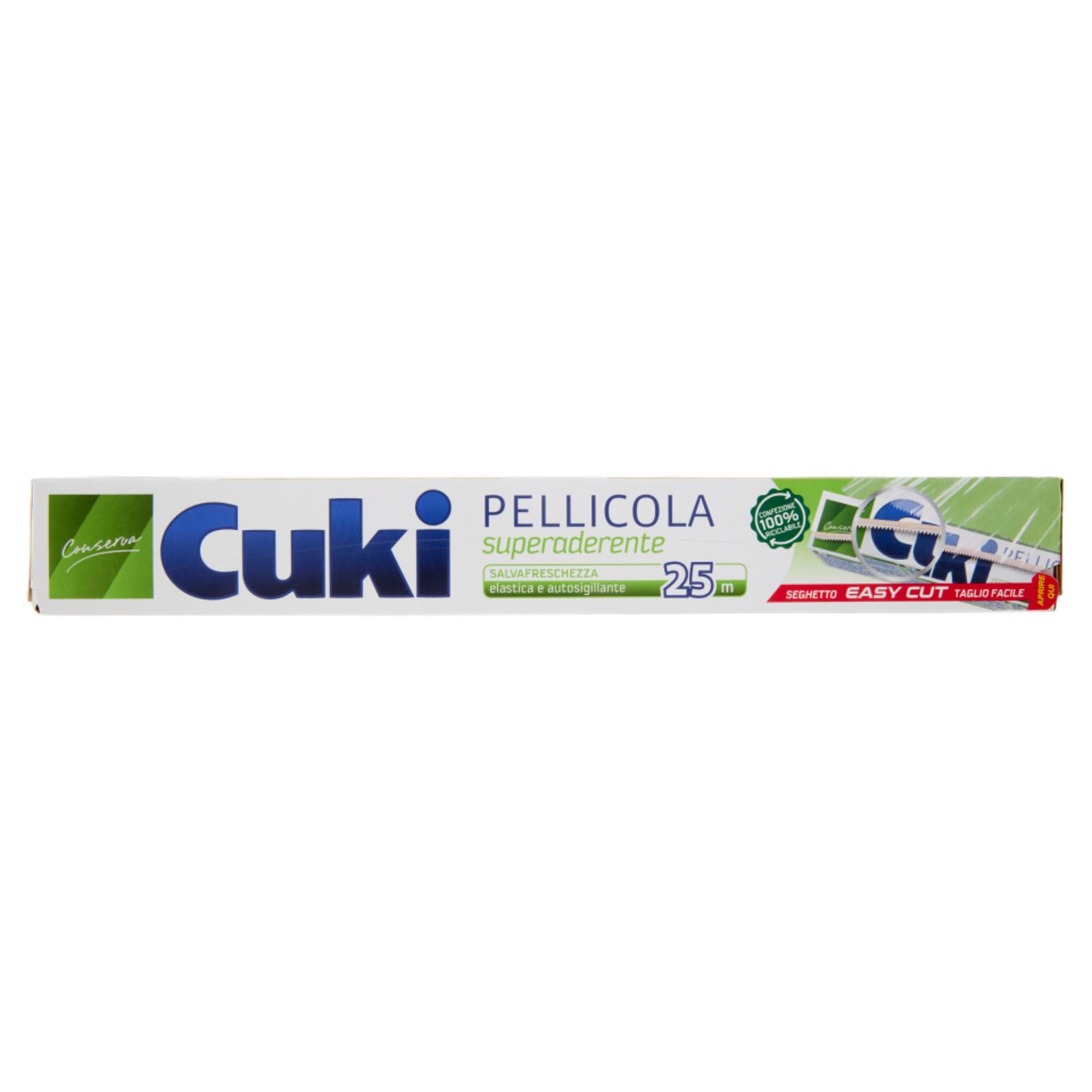 Cuki Pellicola Superaderente garantisce la massima conservazione della freschezza dei cibi. Dall'esperienza di Cuki nasce la nuova e innovativa confezione, totalmente riciclabile, più maneggevole e ancora più funzionale. La pellicola si taglia dal basso verso l'alto grazie alla combinazione della nuova impugnatura ergonomica e del nuovo seghetto curvo: il taglio è sempre preciso e gli sprechi di prodotto sono azzerati! Da sempre attenta all'ambiente, l'astuccio e il seghetto curvo Easy Cut sono realizzati interamente in cartoncino e sono riciclabili entrambi nella raccolta differenziata della carta, senza bisogno di separarli. Seghetto easy cut Realizzato con tecnologie innovative, il nuovo seghetto curvo in cartoncino, 100% riciclabile, permette un taglio facile, preciso e in totale sicurezza, proteggendo la mano e le dita, e riducendo gli sprechi di prodotto. Impugnatura ergonomica L'impugnatura ergonomica, grazie agli spigoli sagomati, ti permette di maneggiare la confezione con più facilità, aumentandone la presa e l'efficacia del taglio della pellicola verso l'alto. Sistema blocca-pellicola Lo speciale sistema si attiva automaticamente alla prima apertura della confezione e ti permette di individuare e recuperare sempre l'inizio del rotolo. Caratteristiche Protettiva e impermeabile: mantiene a lungo la freschezza e il grado di umidità dei tuoi cibi, sia dentro che fuori dal frigorifero. Elastica, autosigillante e superaderente: si conforma perfettamente intorno a qualsiasi tipo di cibo o di contenitore. Massima facilità di utilizzo: nuovo seghetto curvo, nuova impugnatura ergonomica e nuovo sistema blocca-pellicola per un taglio sempre perfetto, una presa sicura per un utilizzo più semplice del prodotto. Non contiene ftalati e BPA.