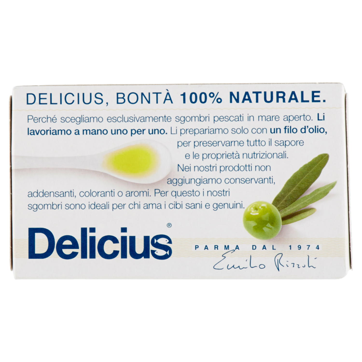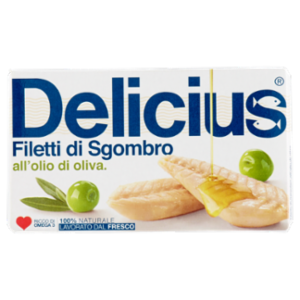 Delicius, bontà 100% naturale. Perché scegliamo esclusivamente sgombri pescati in mare aperto. Li lavoriamo a mano uno per uno. Li prepariamo solo con un filo d'olio, per preservarne tutto il sapore e le proprietà nutrizionali. Nei nostri prodotti non aggiungiamo conservanti, addensanti, coloranti o aromi. Per questo i nostri sgombri sono ideali per chi ama i cibi sani e genuini. Nell'ambito di una alimentazione equilibrata e varia ed uno stile di vita sano, si consiglia il consumo di pesce almeno 2 volta a settimana. Lo Sgombro, pesce azzurro che fornisce preziosi nutrienti, è ricco di Omega 3 (EPA e DHA), acidi grassi essenziali che contribuiscono alla normale funzione cardiaca*. (*l'effetto benefico si ottiene con l'assunzione giornaliera di 250 mg di EPA e DHA)