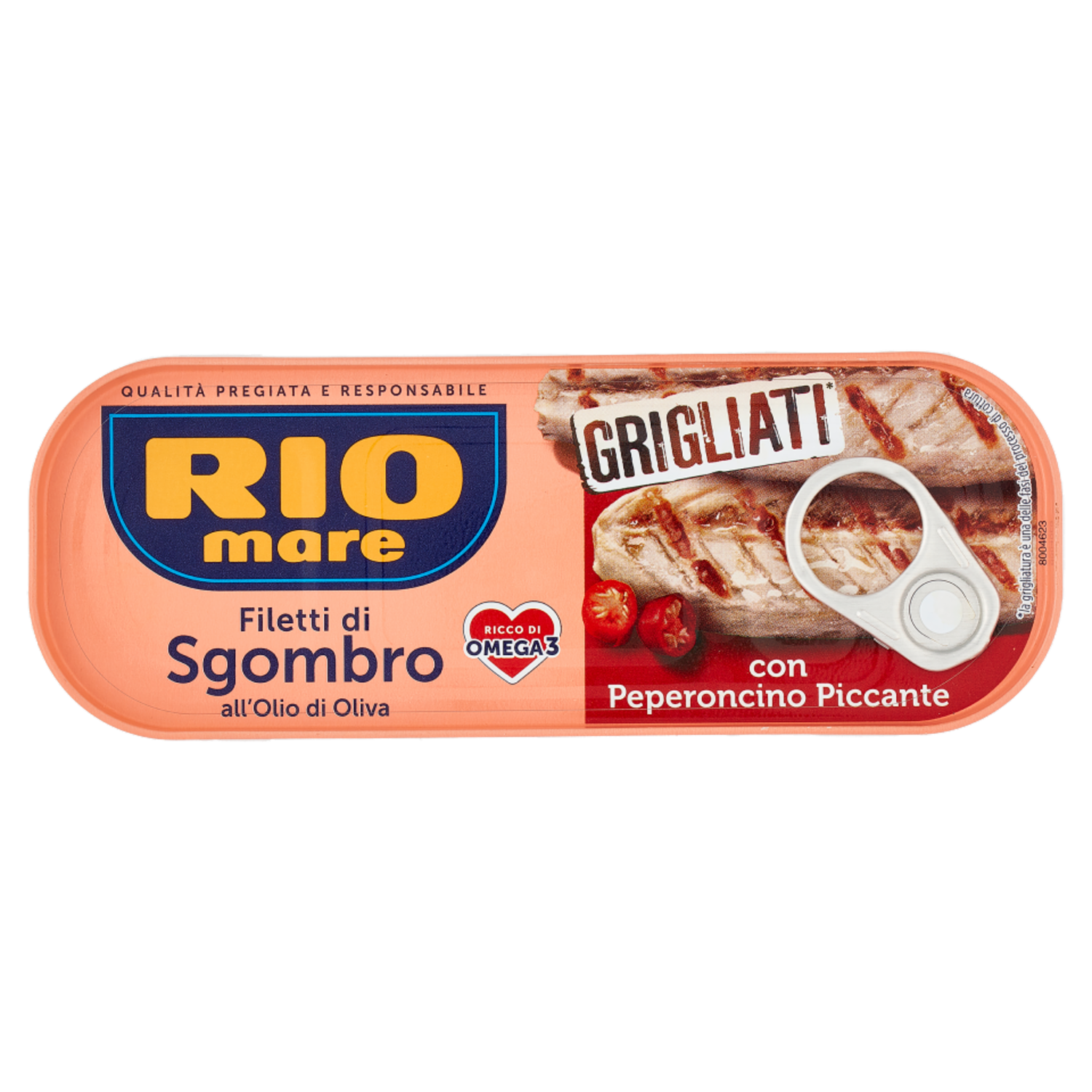 Prova il gusto autentico dei Filetti di Sgombro Grigliati Rio Mare all'Olio di Oliva con Peperoncino: filetti di sgombro lavorati a mano ottenuti da pesci selezionati, sottoposti anche a grigliatura e conditi con olio di oliva e peperoncino piccante. Gustosi e nutrienti, i Filetti di Sgombro Grigliati Rio Mare ti offrono le migliori qualità del pesce azzurro, sono ricchi di proteine nobili e omega 3 (EPA+DHA), acidi grassi essenziali che con 250 mg al giorno contribuiscono alla normale funzione cardiaca in un'alimentazione varia ed equilibrata. Provali anche caldi! Ricco di: vitamina D, niacina, vitamina B12, selenio, acidi grassi omega 3. Fonte di: fosforo. Provalo caldo