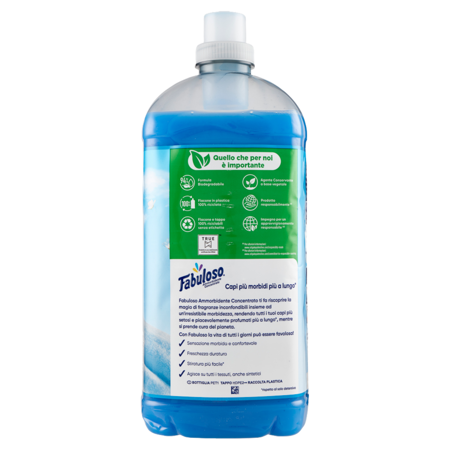 Quello che per noi è importante 94% Formula Biodegradabile Flacone in plastica 100% riciclata Agente Conservante a base vegetale Prodotto responsabilmente ⁽ ⁾ Impegno per un approvvigionamento responsabile ⁽²⁾ ⁽ ⁾ Per ulteriori informazioni: www.colgatepalmolive.com/responsibly-made ⁽²⁾ Per ulteriori informazioni: www.colgatepalmolive.com/committed-to-responsible-sourcing Capi più morbidi più a lungo* Fabuloso Ammorbidente Concentrato ti fa riscoprire la magia di fragranze inconfondibili insieme ad un'irresistibile morbidezza, rendendo tutti i tuoi capi più setosi e piacevolmente profumati più a lungo*, mentre si prende cura del pianeta. Con Fabuloso la vita di tutti i giorni può essere favolosa! - Sensazione morbida e confortevole - Freschezza duratura - Stiratura più facile* - Agisce su tutti i tessuti, anche sintetici *rispetto al solo detersivo Dermatologicamente testato