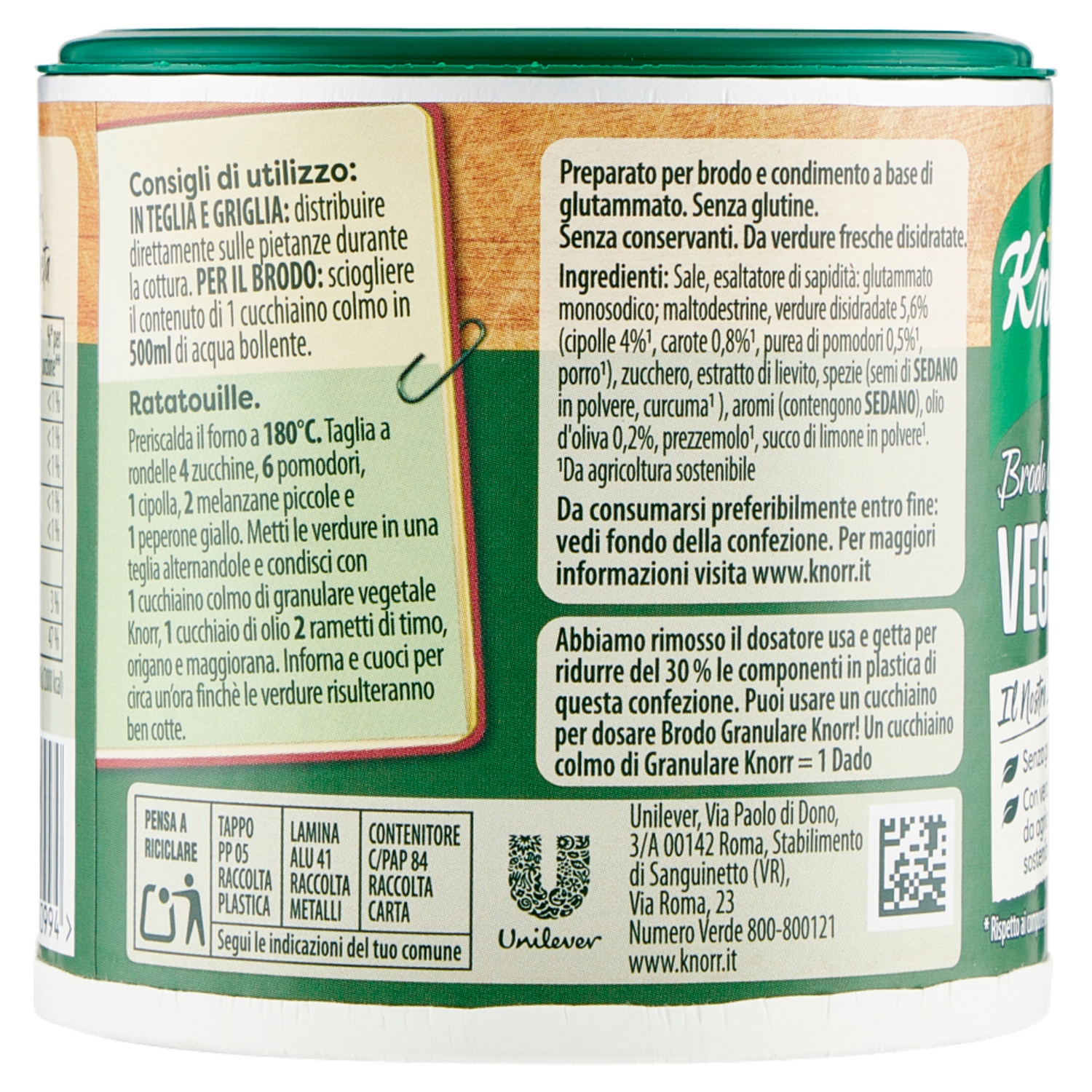 Senza lattosio Con pochi grassi Abbiamo rimosso il dosatore usa e getta per ridurre del 30 % le componenti in plastica di questa confezione. Puoi usare un cucchiaino per dosare Brodo Granulare Knorr! Un cucchiaino colmo di Granulare Knorr = 1 Dado