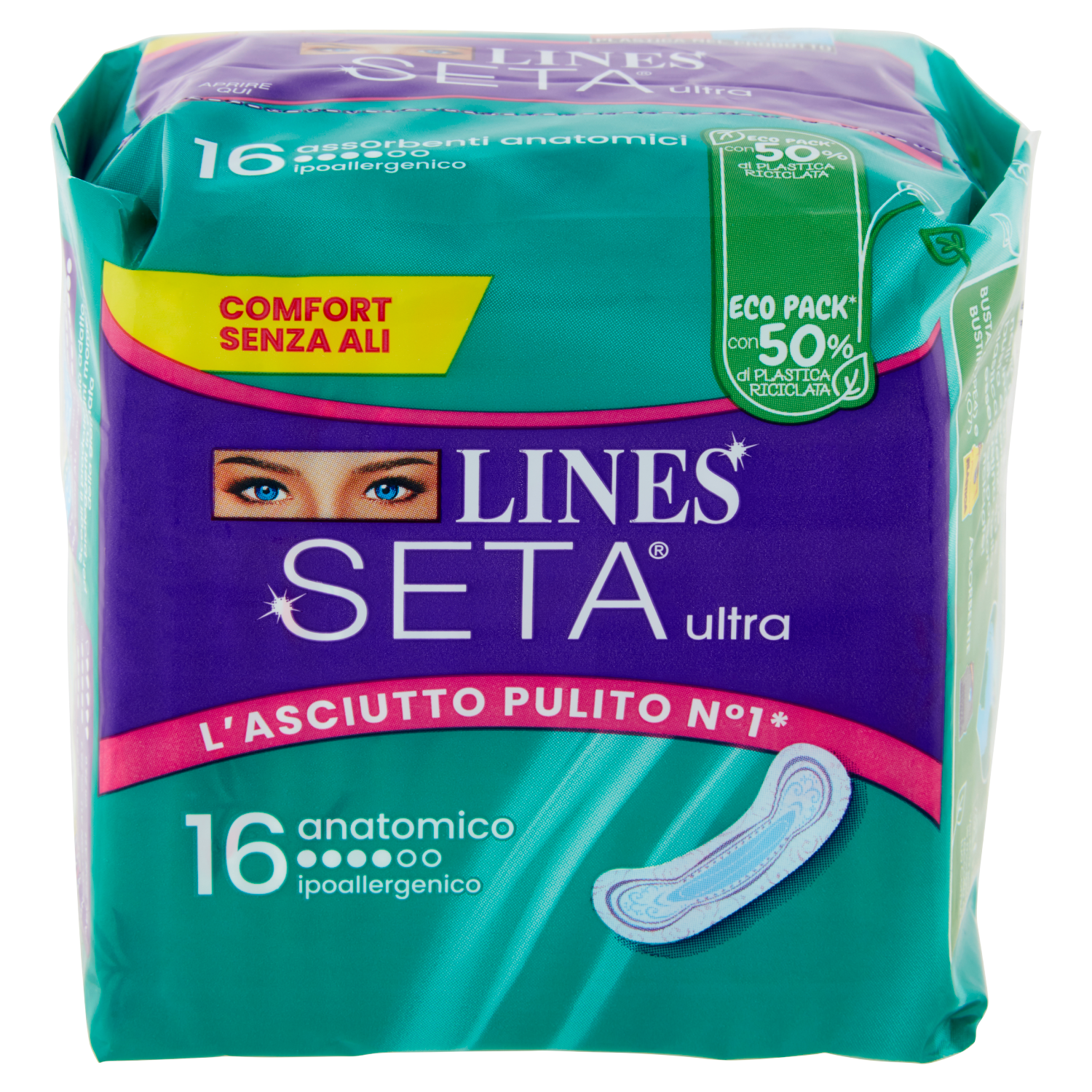 L'asciutto pulito n.1 in Italia Assorbe i liquidi in un instante per un asciutto imbattibile sulla pelle. Asciutto pulito in un istante Comfort senza ali Cuore Lines super assorbente Filtrante seta con fori a imbuto Ipoallergenico Con molecola attiva n-3 - Zero odori www.lines.it