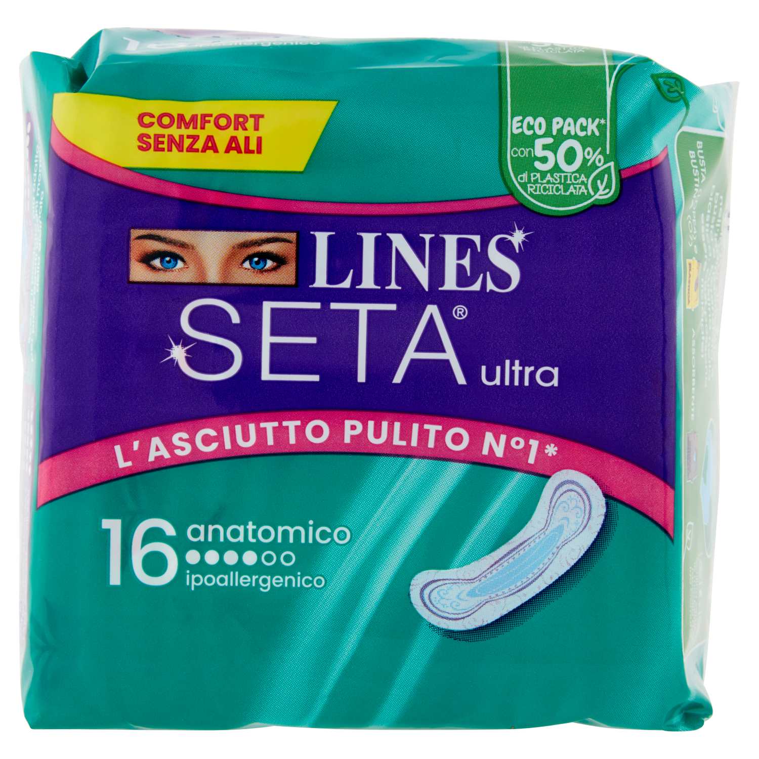 Dedicarci al benessere della donna vuol dire anche prendersi cura del nostro Pianeta. Scopri il nostro impegno sul sito Lines Per le tue notti con il ciclo scegli Lines Seta ultra Notte & Extra disegnati per accompagnare i tuoi movimenti durante tutta la notte E in più ascolta le nuove Sleeplist di Lines su Spotify! Scopri il Seta ultra Più Adatto a Te! Per il giorno Flussi leggeri - cm 20,5 - Assorbenza 2 su 6 Anatomico - cm 24,0 - Assorbenza 4 su 6 Con ali - cm 24,0 - Assorbenza 4 su 6 Lungo con ali - cm 28,4 - Assorbenza 5 su 6 Lady con ali - cm 24,0 - Assorbenza 5 su 6 Per la Notte e per un'Extra Protezione Notte con ali - cm 31,7 - Assorbenza 6 su 6 Extra con ali - cm 36,0 - Assorbenza 7 su 7 Scegli il prodotto più adatto per proteggerti in ogni momento della giornata