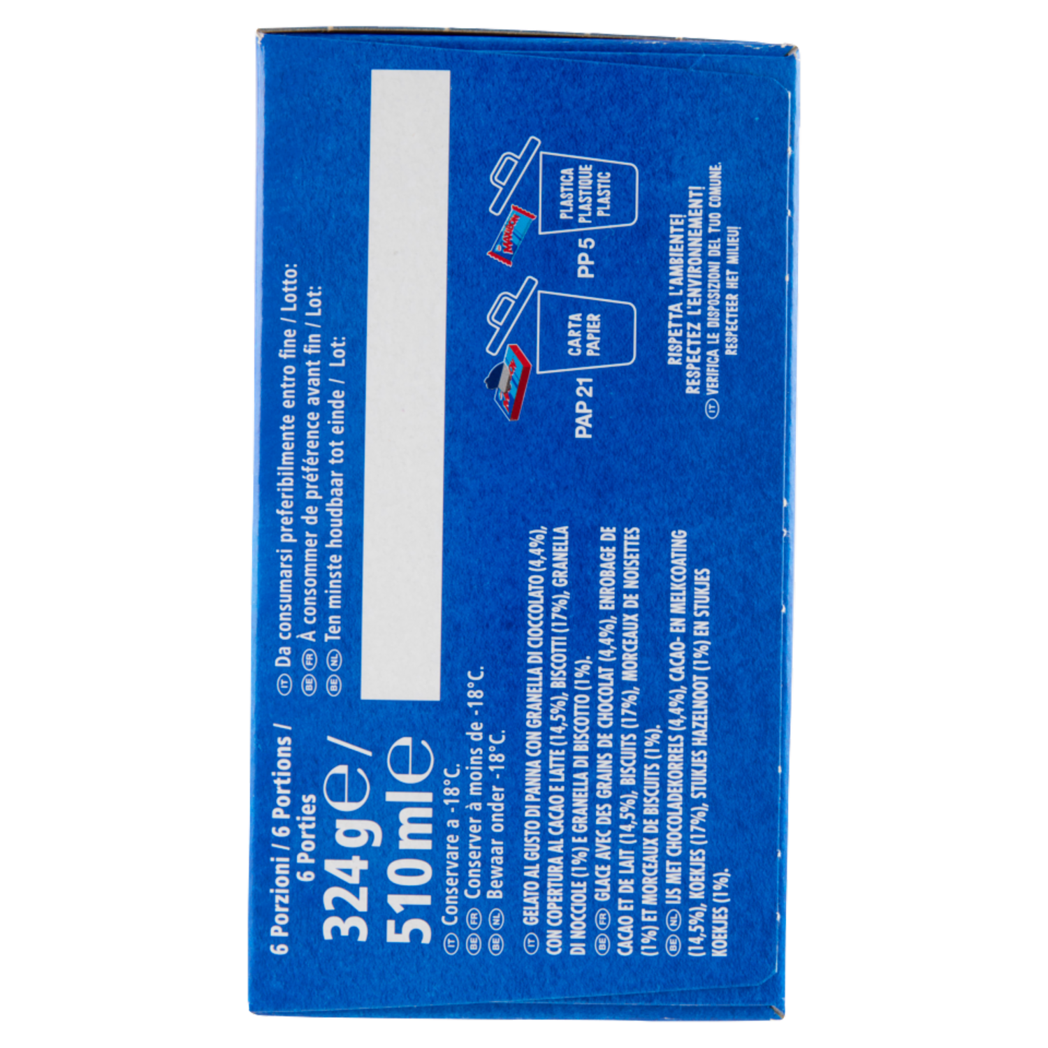 Gelato al gusto di panna con granella di cioccolato (4,4%), con copertura al cacao e latte (14,5%), biscotti (17%), granella di nocciole (1%) e granella di biscotto (1%)