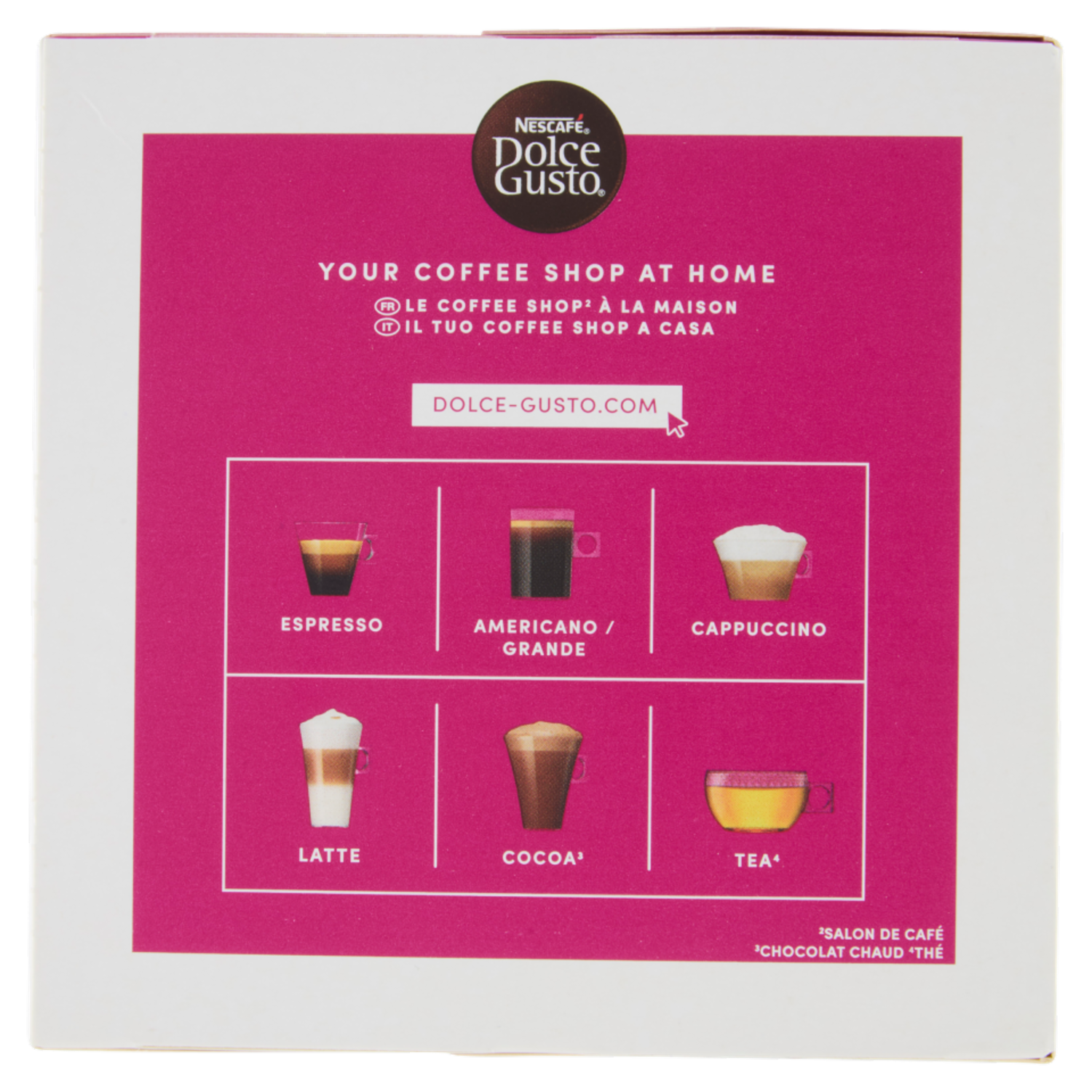 La richezza aromatica di una miscela di pura arabica. Naturalmente decaffeinato ad acqua. Grown respectfully Caffè coltivato con rispetto Per sapere di più: dolce-gusto.com Credi che sia il solito decaffeinato? Il nostro decaffeinato non ha nulla da invidiare ad un espresso eccezionale. Lasciati sorprendere dai suoi ricchi aromi, dalle note sottili di cereali tostati e frutti rossi e dalla sua crema vellutata e delicata. Voglia di un altro espresso? 5 - Espresso 5 - Espresso Decaffeinato 7 - Espresso Intenso 7 - Espresso Intenso Decaffeinato 9 - Ristretto Barista 11 - Ristretto Ardenza 13 - Ristretto Napoli Altre creazioni: dolce-gusto.com - Extra crema* - Arabica selection - Profile | Rich & pleasant - Origins | Colombia - Central America - Brazil - Intensity 5 - 16x Capsule