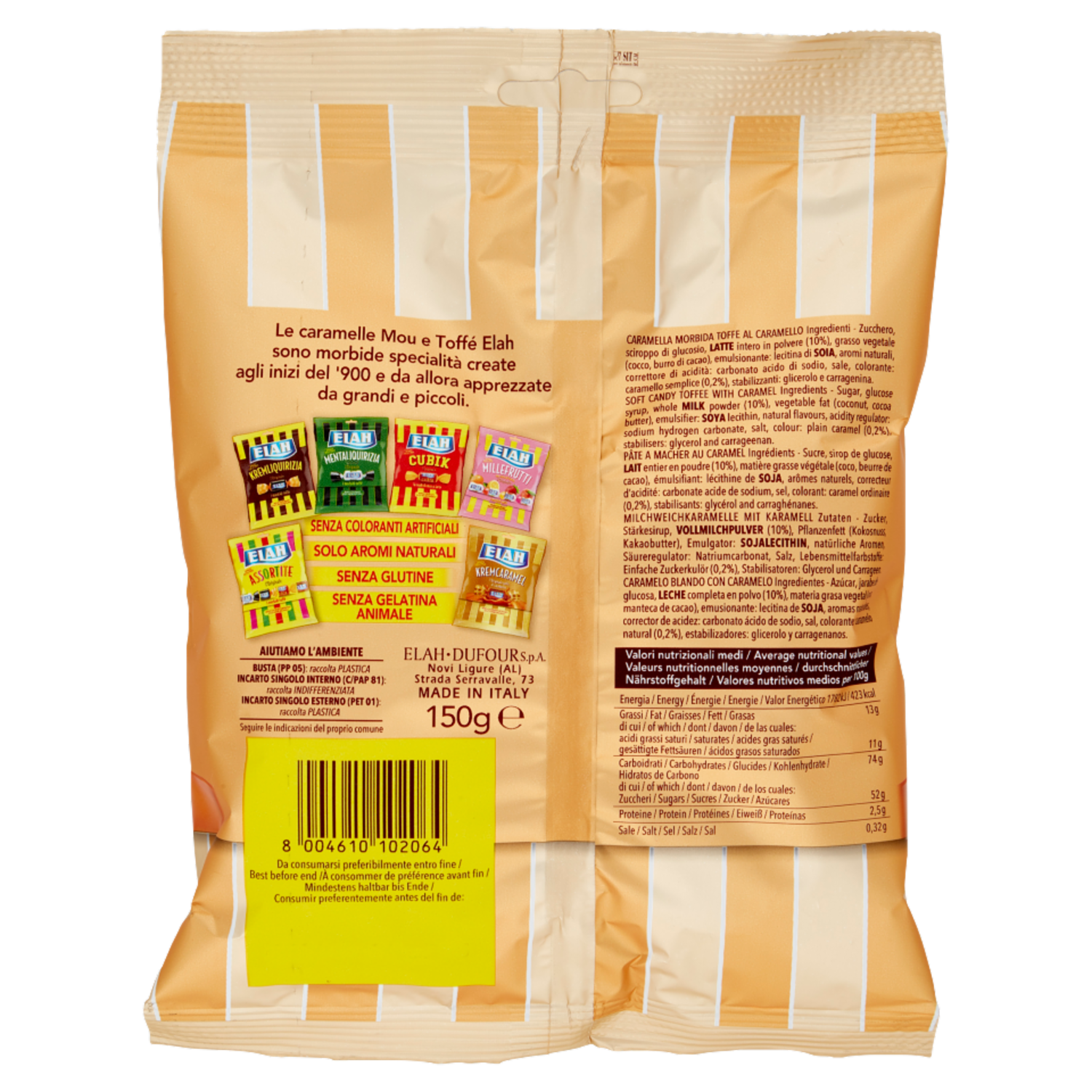 Le caramelle Mou e Toffé Elah sono morbide specialità create agli inizi del '900 e da allora apprezzate da grandi e piccoli. Senza coloranti artificiali Solo aromi naturali Senza glutine Senza gelatina animale