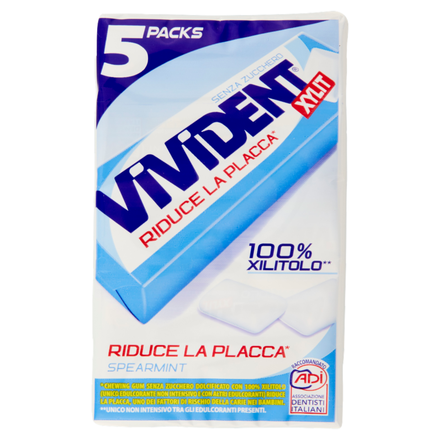 Con la sua formula 100% Xilitolo,** riduce la placca* e aiuta a prenderti cura della tua igiene orale fuori casa. *Chewing gum senza zucchero dolcificato con 100% Xilitolo (unico edulcorante non intensivo e con altri edulcoranti) riduce la placca, uno dei fattori di rischio della carie nei bambini. **Lo Xilitolo è l'unico non intensivo tra gli edulcoranti presenti. Contiene anche altri edulcoranti in minima quantità. La carie è dovuta a molteplici fattori di rischio, l'intervento su uno di questi può anche non avere un effetto benefico. Uno stile di vita sano e una dieta varia ed equilibrata sono importanti. Vivident Xylit aiuta a prenderti cura della tua igiene orale fuori casa. ADI consiglia: 1) Regolari controlli dal dentista 2) Lavarsi i denti almeno 2 volte al giorno 3) Usare il filo interdentale L'igiene orale è una buona abitudine Raccomandato ADI - Associazione Dentisti Italiani