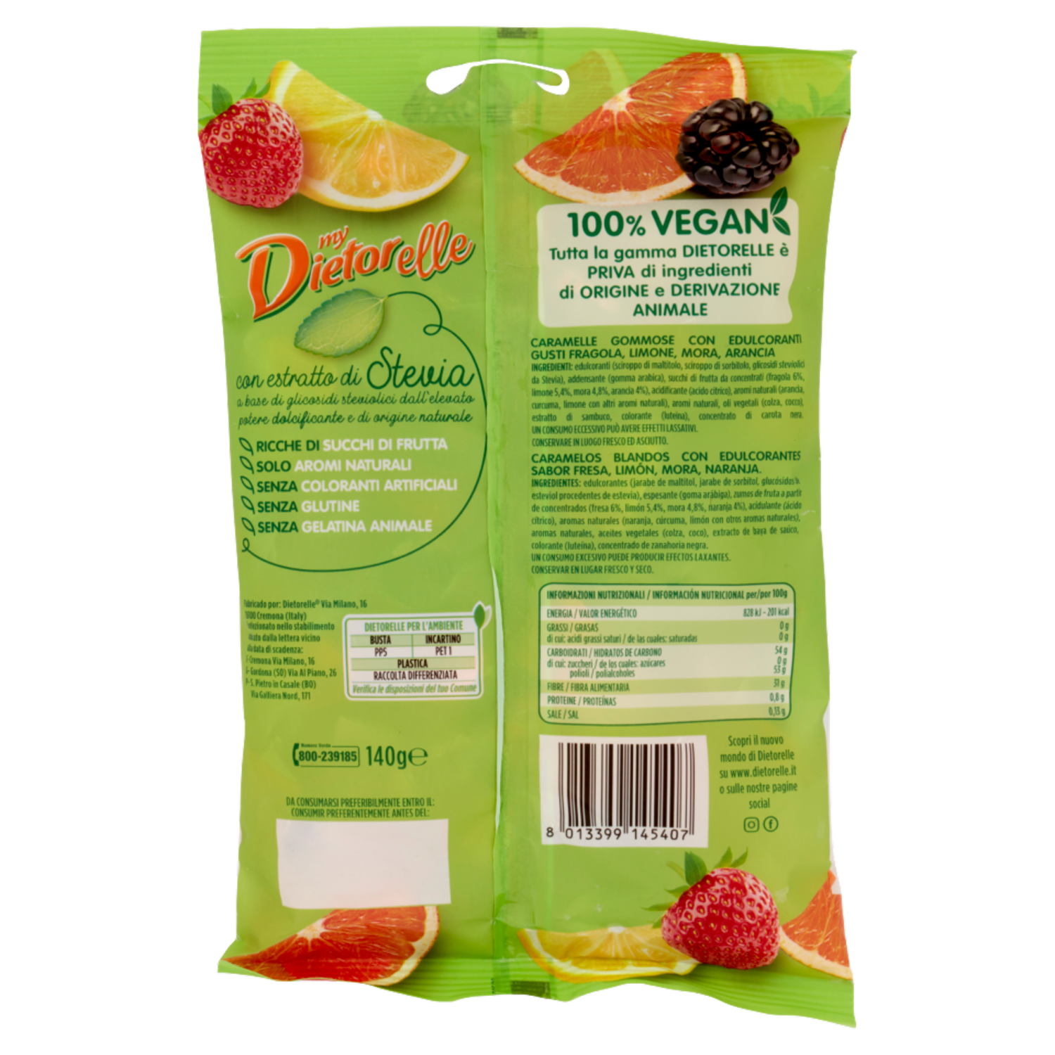 con estratto di Stevia a base di glicosidi steviolici dall'elevato potere dolcificante e di origine naturale - Ricche di succhi di frutta - Solo aromi naturali - Senza coloranti artificiali - Senza glutine - Senza gelatina animale 100% Vegan Tutta la gamma Dietorelle è Priva di ingredienti di Origine e Derivazione Animale