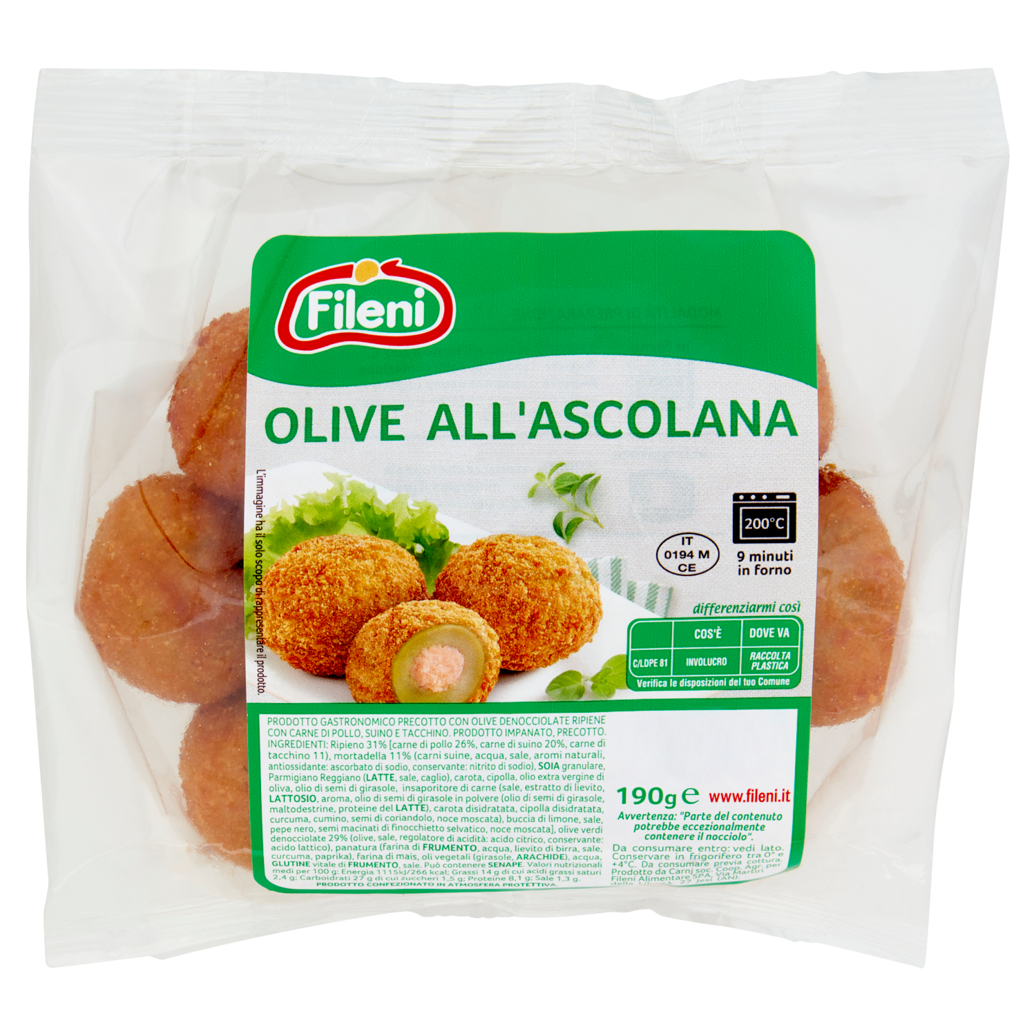 Prodotto gastronomico precotto con olive denocciolate ripiene con carne di pollo, suino e tacchino. Prodotto impanato, precotto