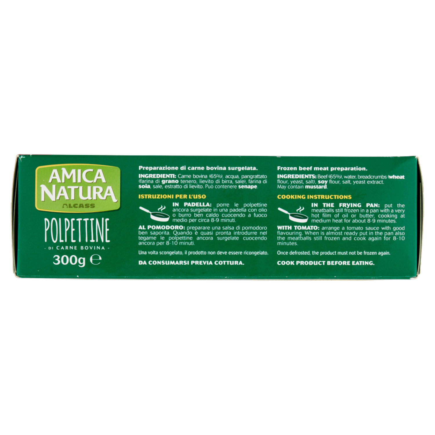 da 30 anni i Tuoi Surgelati Perché Amica Natura seleziona da 30 anni solo gli ingredienti migliori come piace a te! Bontà, gusto e praticità sono i nostri semplici segreti. Le nostre polpettine di bovino, da sempre, hanno un impasto semplice e con pochi ingredienti. Polpettine di carne bovina - Solo carne da allevamenti selezionati, farina e sale - Comode e veloci da preparare - Subito pronti in 9 minuti dal freezer - Usale per creare il tuo piatto preferito. - Senza conservanti Il nostro unico conservante è il freddo! I surgelati, per legge, non contengono nessun conservante aggiunto e aiutano a ridurre gli sprechi di cibo grazie alla loro lunga durata.