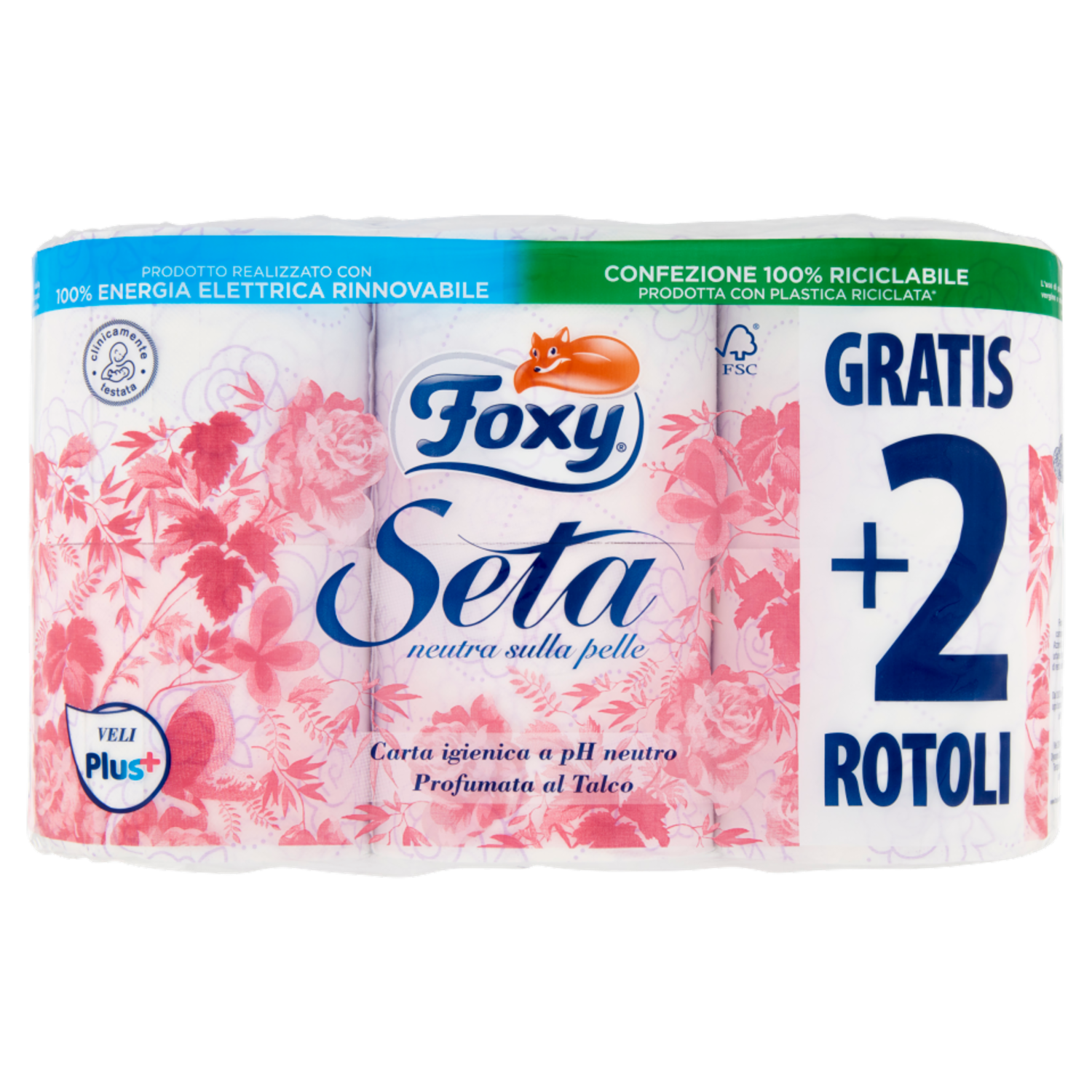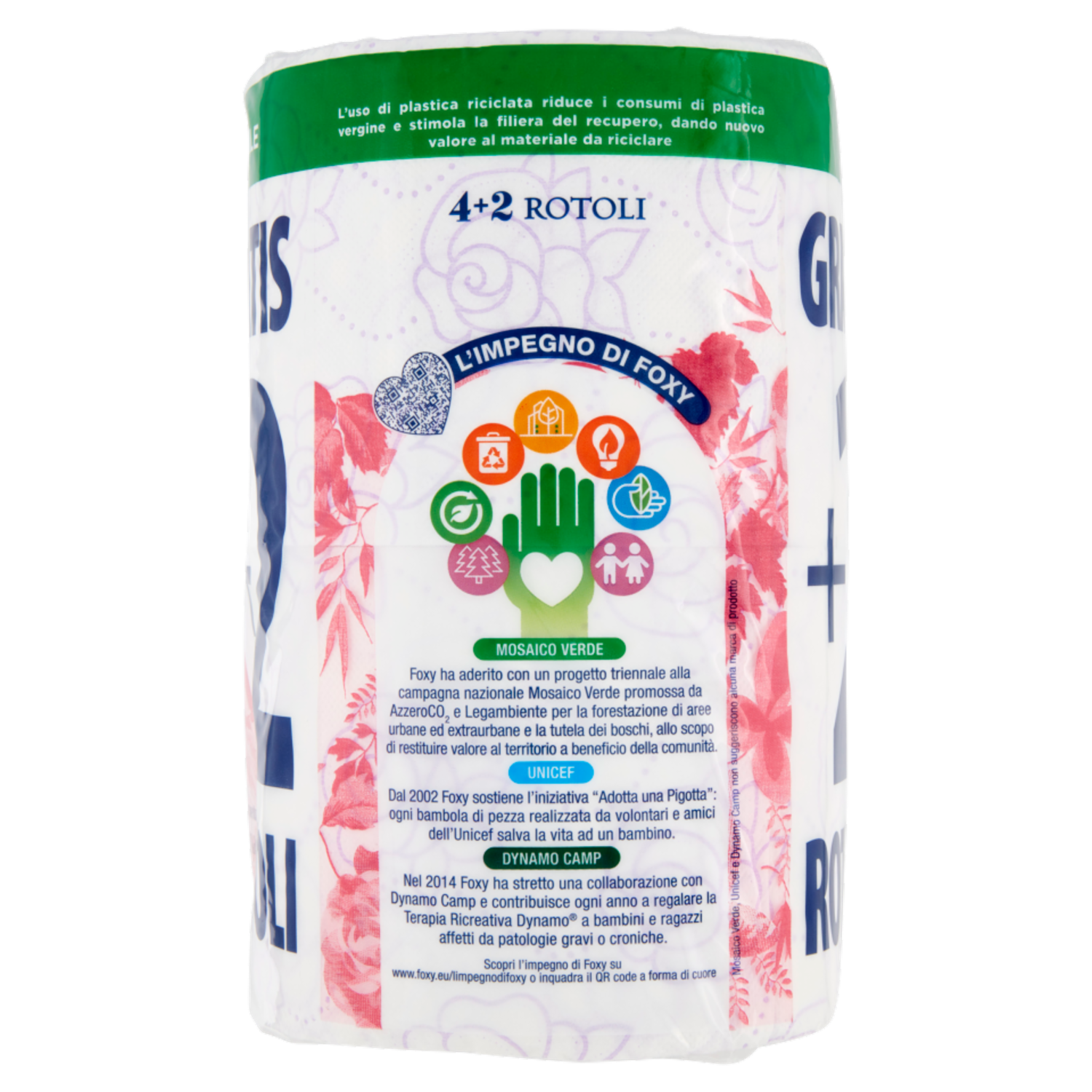 Foxy Sempre vicina a te. Foxy Seta è prodotta con cellulose certificate provenienti da foreste certificate e da fonti controllate**. Foxy Seta è stata realizzata usando energia elettrica pulita e sostenibile, generata da fonti rinnovabili come il sole, il vento e l'acqua. Adatta anche a WC mobili (camper, barche). Nello sviluppo di Foxy Seta non sono stati effettuati test sugli animali. **Per saperne di più, leggere le informazioni poste sul lato della confezione. L'impegno di Foxy Mosaico Verde - Foxy ha aderito con un progetto triennale alla campagna nazionale Mosaico Verde promossa da AzzeroCO₂ e Legambiente per la forestazione di aree urbane ed extraurbane e la tutela dei boschi, allo scopo di restituire valore al territorio a beneficio della comunità. Unicef - Dal 2002 Foxy sostiene l'iniziativa "Adotta una Pigotta": ogni bambola di pezza realizzata da volontari e amici dell'Unicef salva la vita ad un bambino. Dynamo Camp - Nel 2014 Foxy ha stretto una collaborazione con Dynamo Camp e contribuisce ogni anno e regalare la Terapia Ricreativa Dynamo a bambini e ragazzi affetti da patologie gravi o croniche. Scopri l'impegno di Foxy su www.foxy.eu/limpegnodifoxy o inquadra il QR code a forma di cuore Mosaico Verde, Unicef e Dynamo Camp non suggeriscono alcuna marca di prodotto L'uso di plastica riciclata riduce i consumi di plastica vergine e stimola la filiera del recupero, dando nuovo valore al materiale da riciclare L'intero processo produttivo di Foxy Seta, dalla produzione della carta alla sua trasformazione, è realizzato con l'utilizzo del 100% di energia elettrica rinnovabile