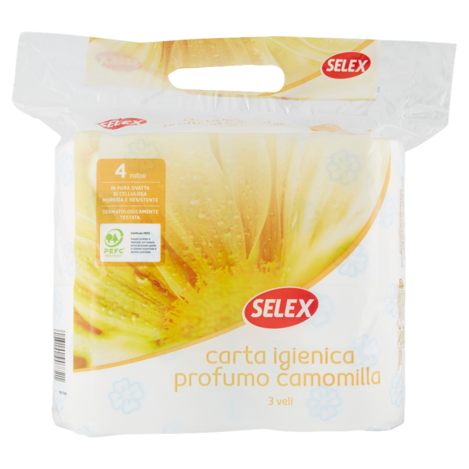 La Carta Igienica Selex è realizzata utilizzando esclusivamente pura cellulosa vergine. Profumata alla camomilla, è soffice e delicata al tatto.