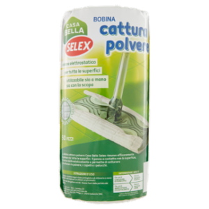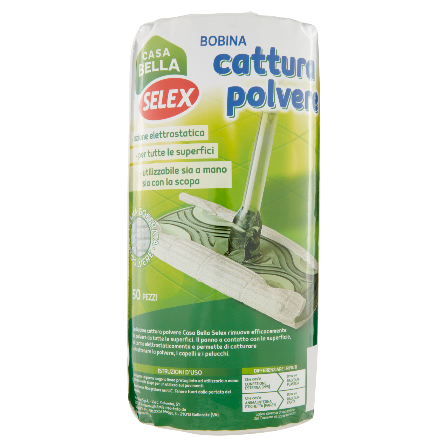 La bobina cattura polvere Casa Bella Selex rimuove efficacemente la polvere da tutte le superfici. Il panno a contatto con la superficie, si carica elettrostaticamente e permette di catturare e trattenere la polvere, i capelli e i pelucchi.