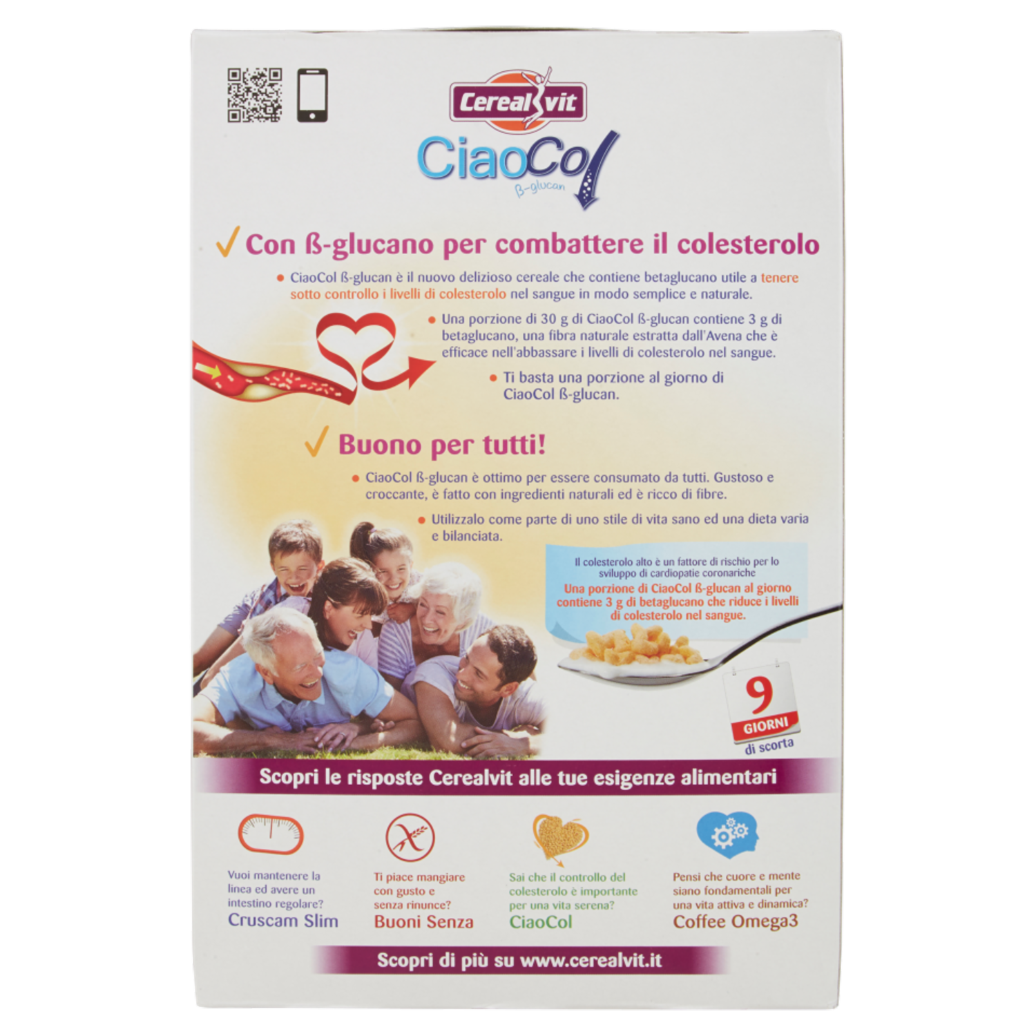Ogni porzione* contiene 3g di betaglucano che - Abbassa i livelli di colesterolo nel sangue Il colesterolo alto è un fattore di rischio per lo sviluppo di malattie coronariche - Ricco di fibre - Adatto a tutti *una porzione equivale a circa 8 cucchiai di prodotto Con β-glucano per combattere il colesterolo - CiaoCol β-glucan è il nuovo delizioso cereale che contiene betaglucano utile a tenere sotto controllo i livelli di colesterolo nel sangue in modo semplice e naturale. - Una porzione di 30 g di CiaoCol β-glucan contiene 3 g di betaglucano, una fibra naturale estratta dall'Avena che è efficace nell'abbassare i livelli di colesterolo nel sangue. - Ti basta una porzione al giorno di CiaoCol β-glucan. Buono per tutti! - CiaoCol β-glucan è ottimo per essere consumato da tutti. Gustoso e croccante, è fatto con ingredienti naturali ed è ricco di fibre. - Utilizzalo come parte di uno stile di vita sano ed una dieta varia e bilanciata. Il colesterolo alto è un fattore di rischio per lo sviluppo di cardiopatie coronariche Una porzione di CiaoCol β-glucan al giorno contiene 3 g di betaglucano che riduce i livelli di colesterolo nel sangue. 9 Giorni di scorta Croccanti cuoricini con Betaglucano, ricchi di fibre. Abbassa i livelli di colesterolo nel sangue. Adatto a tutti