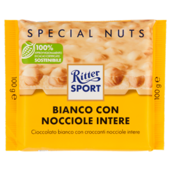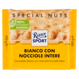 Cioccolato bianco con nocciole intere (25 %) e riso soffiato (3 %)