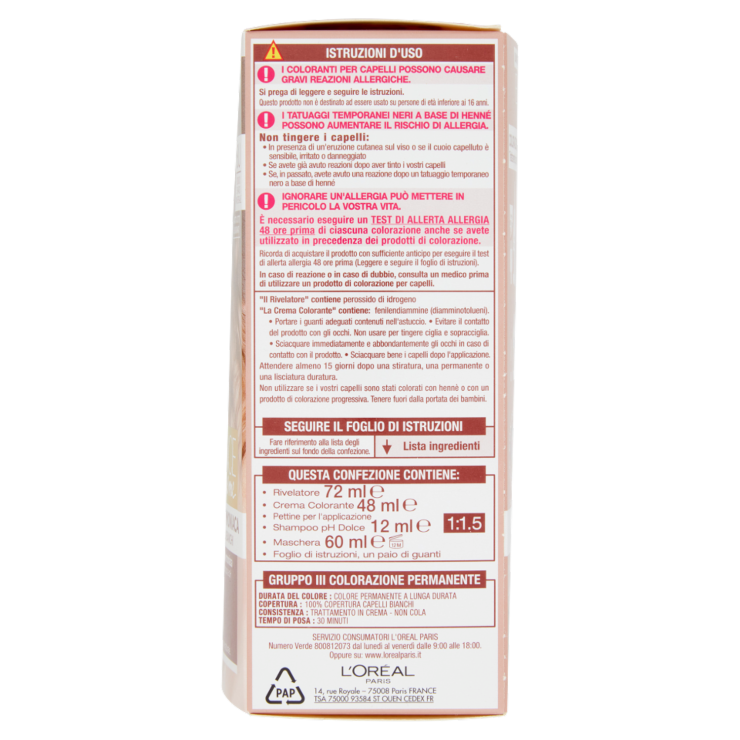 IMPORTANTE: I COLORANTI PER CAPELLI POSSONO CAUSARE REAZIONI ALLERGICHE ESEGUIRE IMPERATIVAMENTE IL TEST DI ALLERTA ALLERGIA 48 ORE PRIMA DELL'USO ISTRUZIONI D'USO I COLORANTI PER CAPELLI POSSONO CAUSARE GRAVI REAZIONI ALLERGICHE. Si prega di leggere e seguire le istruzioni. Questo prodotto non è destinato ad essere usato su persone di età inferiore ai 16 anni. I TATUAGGI TEMPORANEI NERI A BASE DI HENNÉ POSSONO AUMENTARE IL RISCHIO DI ALLERGIA. Non tingere i capelli: - In presenza di un'eruzione cutanea sul viso o se il cuoio capelluto è sensibile, irritato o danneggiato - Se avete già avuto reazioni dopo aver tinto i vostri capelli - Se, in passato, avete avuto una reazione dopo un tatuaggio temporaneo nero a base di henné IGNORARE UN'ALLERGIA PUÒ METTERE IN PERICOLO LA VOSTRA VITA. È necessario eseguire un TEST DI ALLERTA ALLERGIA 48 ore prima di ciascuna colorazione anche se avete utilizzato in precedenza dei prodotti di colorazione. Ricorda di acquistare il prodotto con sufficiente anticipo per eseguire il test di allerta allergia 48 ore prima (Leggere e seguire il foglio di istruzioni). In caso di reazione o in caso di dubbio, consulta un medico prima di utilizzare un prodotto di colorazione per capelli. "Il Rivelatore" contiene perossido di idrogeno "La Crema Colorante" contiene: fenilendiammine (diamminotolueni). - Portare i guanti adeguati contenuti nell'astuccio. - Evitare il contatto del prodotto con gli occhi. Non usare per tingere ciglia e sopracciglia. - Sciacquare immediatamente e abbondantemente gli occhi in caso di contatto con il prodotto. - Sciacquare bene i capelli dopo l'applicazione. Attendere almeno 15 giorni dopo una stiratura, una permanente o una lisciatura duratura. Non utilizzare se i vostri capelli sono stati colorati con hennè o con un prodotto di colorazione progressiva. Tenere fuori dalla portata dei bambini. SEGUIRE IL FOGLIO DI ISTRUZIONI