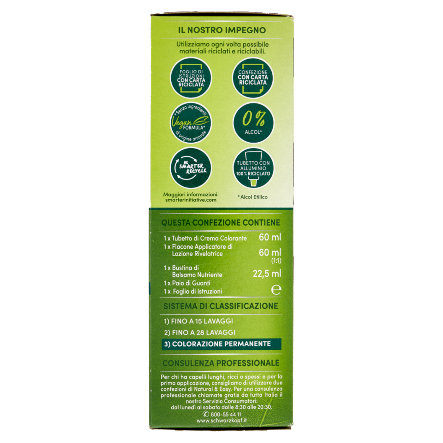 Colorazione permanente nutriente Risultato colore & ingredienti di origine naturale Il marchio Schwarzkopf Natural & Easy è amato per la sua affidabilità e per un risultato colore naturale, ricco di riflessi. Con il 92%* di ingredienti di origine naturale (* inclusa l'acqua), Natural & Easy esalta il colore naturale dei capelli donando luminosità. I restanti ingredienti, che costituiscono l'8% della formula, garantiscono il risultato colore. La nostra crema colorante nutriente con acqua di Lavanda Francese e tre tonalità colore pre-miscelate dona un risultato colore naturale, ricco di riflessi luminosi e il 100% di copertura dei capelli bianchi. Perfetto nutrimento Il Balsamo Nutriente con Olio d'Oliva del Mediterraneo è composto dal 97%* di ingredienti di origine naturale (*inclusa l'acqua) e dona nutrimento e morbidezza ai capelli per un colore luminoso. Le nostre promesse Utilizziamo ogni volta possibile materiali riciclati e riciclabili Ingredients origin 92%* Origine naturale - Olea Europea (Olive) Fruit Oil, Lavender Water, Emollient & Humectant Agent, Aqua, Consistence Regulator L'Olio d'Oliva, di origine naturale, può aiutare a rendere i capelli più morbidi. * inclusa l'acqua Il restante 8%** - Anionic Surfactant, Nonionic Surfactant, Emulsifying Agent, Thickener, Solvent, Surfactant Agent, Cationic Surfactant, Chelating Agent, Antioxidants, Cationic Polymers, Pigments, Perfume, Preservative, PH Agent, Stabilizing Agent, Oxidizing Agent, Alkaline Agent Ingredienti necessari per garantire il risultato colore (pigmenti coloranti) ** non di origine naturale Per l'elenco degli ingredienti dettagliati consultare il fondo di questa confezione.