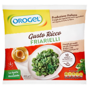 Friarielli I Friarielli Gusto Ricco sono una preparazione tipica della cucina napoletana e romana. Buoni e ricchi di sapore, soddisfano anche i palati più esigenti. Orogel è alla costante ricerca delle scelte più sostenibili Questa busta è già di dimensioni e spessore ridotti al minimo Questo materiale conserva al meglio il prodotto al suo interno Busta Riciclabile Facile da smaltire nella raccolta della plastica Il suo riciclo darà vita a nuovi oggetti